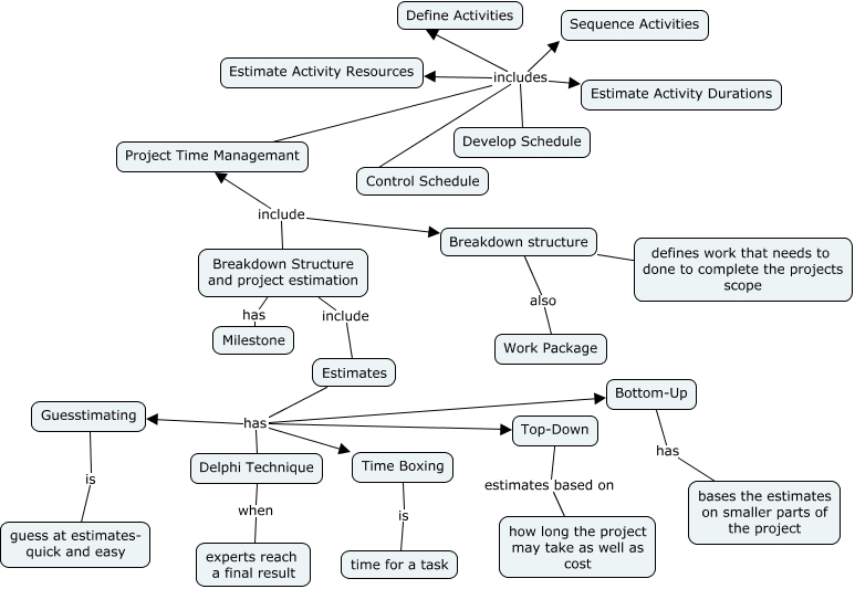 This Concept Map, created with IHMC CmapTools, has information related to: CH6, Top-Down estimates based on how long the project may take as well as cost, Time Boxing is time for a task, Project Time Managemant includes Control Schedule, Breakdown Structure and project estimation include Estimates, Project Time Managemant includes Estimate Activity Durations, Delphi Technique when experts reach a final result, Estimates has Bottom-Up, Breakdown structure also Work Package, Bottom-Up has bases the estimates on smaller parts of the project, Breakdown Structure and project estimation has Milestone, Guesstimating is guess at estimates- quick and easy, Estimates has Top-Down, Estimates has Delphi Technique, Breakdown structure ???? defines work that needs to done to complete the projects scope, Project Time Managemant includes Estimate Activity Resources, Project Time Managemant includes Develop Schedule, Breakdown Structure and project estimation include Project Time Managemant, Breakdown Structure and project estimation include Breakdown structure, Estimates has Time Boxing, Estimates has Guesstimating