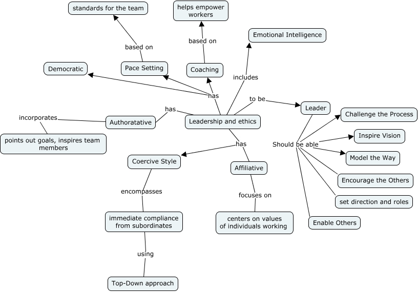 This Concept Map, created with IHMC CmapTools, has information related to: Ch13, Leadership and ethics has Authoratative, Leader Should be able Inspire Vision, Leader Should be able Enable Others, Leadership and ethics to be Leader, Affiliative focuses on centers on values of individuals working, immediate compliance from subordinates using Top-Down approach, Coaching based on helps empower workers, Leader Should be able Model the Way, Leadership and ethics has Pace Setting, Leadership and ethics has Coercive Style, Leadership and ethics has Affiliative, Leadership and ethics includes Emotional Intelligence, Leadership and ethics has Democratic, Authoratative incorporates points out goals, inspires team members, Coercive Style encompasses immediate compliance from subordinates, Leader Should be able Challenge the Process, Leadership and ethics has Coaching, Pace Setting based on standards for the team, Leader Should be able Encourage the Others, Leader Should be able set direction and roles