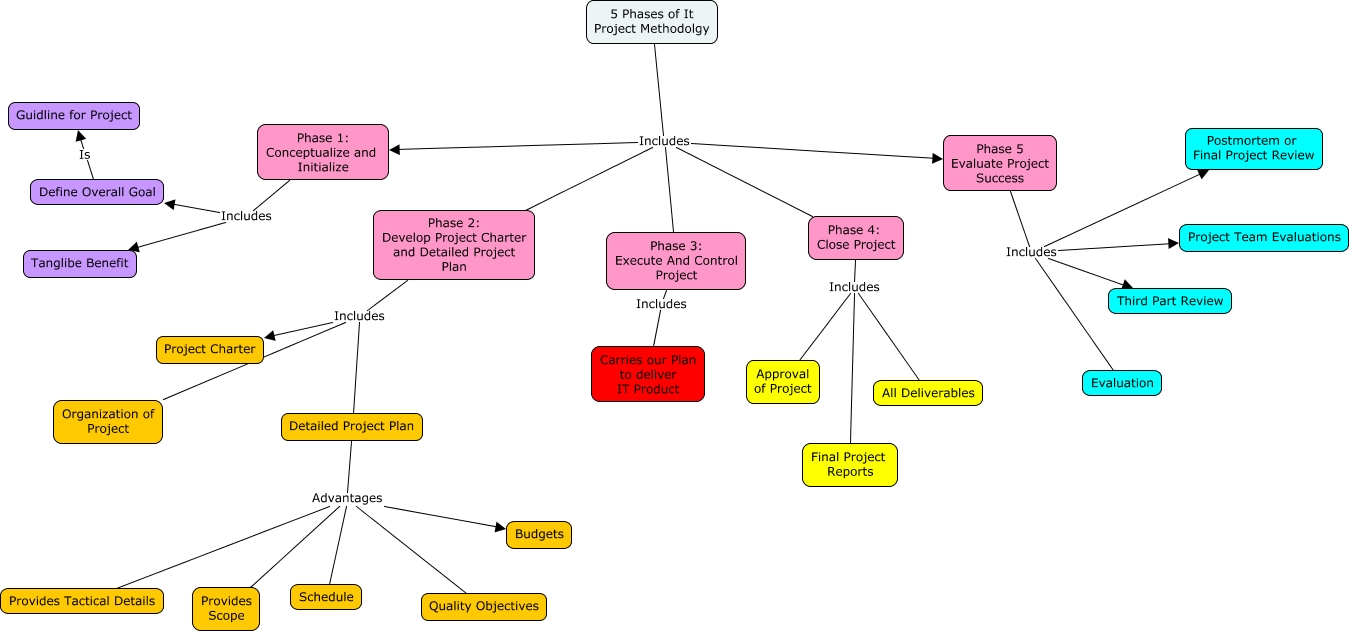 This Concept Map, created with IHMC CmapTools, has information related to: Chapter 2 Phases of Project Methodology, Detailed Project Plan Advantages Budgets, Phase 3: Execute And Control Project Includes Carries our Plan to deliver IT Product, Detailed Project Plan Advantages Schedule, Phase 1: Conceptualize and Initialize Includes Define Overall Goal, 5 Phases of It Project Methodolgy Includes Phase 1: Conceptualize and Initialize, Detailed Project Plan Advantages Quality Objectives, Phase 5 Evaluate Project Success Includes Postmortem or Final Project Review, Phase 4: Close Project Includes Approval of Project, Phase 4: Close Project Includes Final Project Reports, Phase 2: Develop Project Charter and Detailed Project Plan Includes Organization of Project, 5 Phases of It Project Methodolgy Includes Phase 5 Evaluate Project Success, Phase 5 Evaluate Project Success Includes Evaluation, Define Overall Goal Is Guidline for Project, Phase 5 Evaluate Project Success Includes Project Team Evaluations, Phase 2: Develop Project Charter and Detailed Project Plan Includes Detailed Project Plan, Phase 2: Develop Project Charter and Detailed Project Plan Includes Project Charter, Phase 5 Evaluate Project Success Includes Third Part Review, 5 Phases of It Project Methodolgy Includes Phase 2: Develop Project Charter and Detailed Project Plan, Phase 4: Close Project Includes All Deliverables, Detailed Project Plan Advantages Provides Tactical Details