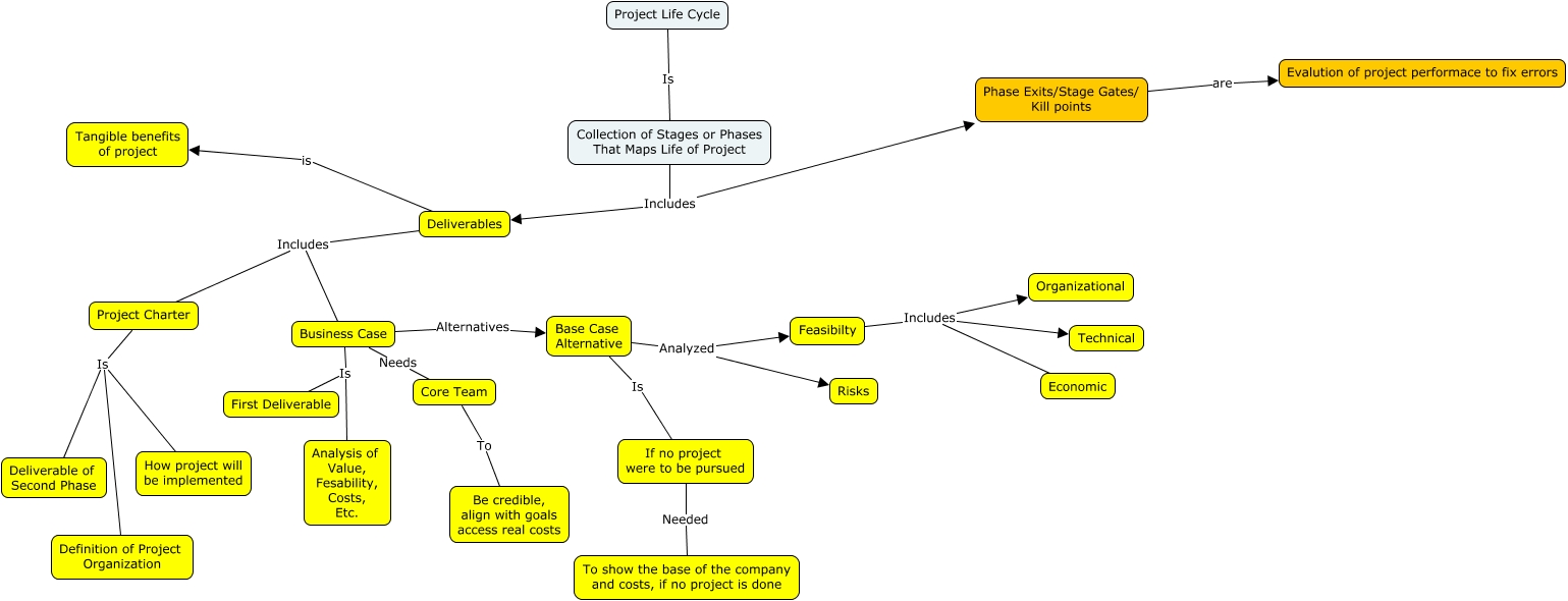 This Concept Map, created with IHMC CmapTools, has information related to: Chapter 2 Project Life Cycle, Business Case Is First Deliverable, Feasibilty Includes Economic, Project Charter Is How project will be implemented, Deliverables Includes Project Charter, Project Charter Is Deliverable of Second Phase, Business Case Alternatives Base Case Alternative, Core Team To Be credible, align with goals access real costs, Deliverables Includes Business Case, Base Case Alternative Is If no project were to be pursued, Feasibilty Includes Technical, Business Case Needs Core Team, Project Charter Is Definition of Project Organization, Phase Exits/Stage Gates/ Kill points are Evalution of project performace to fix errors, Collection of Stages or Phases That Maps Life of Project Includes Phase Exits/Stage Gates/ Kill points, Project Life Cycle Is Collection of Stages or Phases That Maps Life of Project, Business Case Is Analysis of Value, Fesability, Costs, Etc., If no project were to be pursued Needed To show the base of the company and costs, if no project is done, Deliverables is Tangible benefits of project, Base Case Alternative Analyzed Risks, Base Case Alternative Analyzed Feasibilty