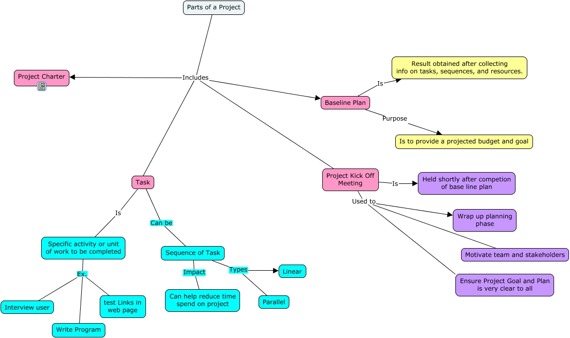 This Concept Map, created with IHMC CmapTools, has information related to: Chapter 3 Parts of a Project, Project Kick Off Meeting Used to Ensure Project Goal and Plan is very clear to all, Parts of a Project Includes Project Charter, Sequence of Task Types Parallel, Parts of a Project Includes Task, Parts of a Project Includes Project Kick Off Meeting, Project Kick Off Meeting Is Held shortly after competion of base line plan, Project Kick Off Meeting Used to Wrap up planning phase, Sequence of Task Impact Can help reduce time spend on project, Specific activity or unit of work to be completed Ex. Write Program, Baseline Plan Purpose Is to provide a projected budget and goal, Baseline Plan Is Result obtained after collecting info on tasks, sequences, and resources., Parts of a Project Includes Baseline Plan, Task Can be Sequence of Task, Specific activity or unit of work to be completed Ex. Interview user, Task Is Specific activity or unit of work to be completed, Specific activity or unit of work to be completed Ex. test Links in web page, Project Kick Off Meeting Used to Motivate team and stakeholders, Sequence of Task Types Linear