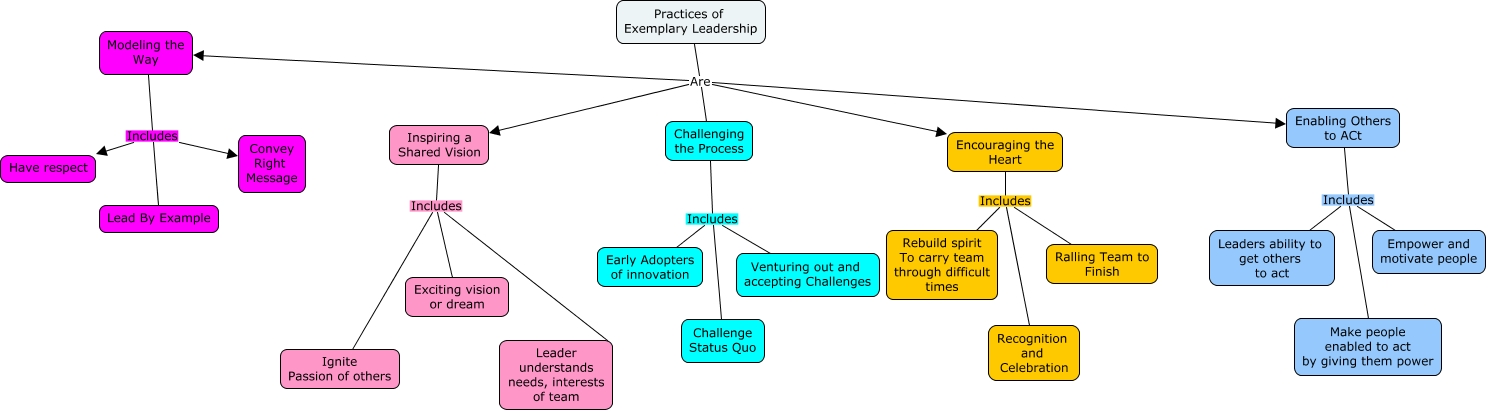 This Concept Map, created with IHMC CmapTools, has information related to: Chapter 13 Exemplary Leadership, Encouraging the Heart Includes Rebuild spirit To carry team through difficult times, Practices of Exemplary Leadership Are Modeling the Way, Enabling Others to ACt Includes Leaders ability to get others to act, Inspiring a Shared Vision Includes Ignite Passion of others, Practices of Exemplary Leadership Are Inspiring a Shared Vision, Enabling Others to ACt Includes Make people enabled to act by giving them power, Modeling the Way Includes Convey Right Message, Modeling the Way Includes Have respect, Modeling the Way Includes Lead By Example, Practices of Exemplary Leadership Are Enabling Others to ACt, Practices of Exemplary Leadership Are Encouraging the Heart, Challenging the Process Includes Challenge Status Quo, Encouraging the Heart Includes Recognition and Celebration, Enabling Others to ACt Includes Empower and motivate people, Challenging the Process Includes Venturing out and accepting Challenges, Inspiring a Shared Vision Includes Leader understands needs, interests of team, Challenging the Process Includes Early Adopters of innovation, Encouraging the Heart Includes Ralling Team to Finish, Practices of Exemplary Leadership Are Challenging the Process, Inspiring a Shared Vision Includes Exciting vision or dream