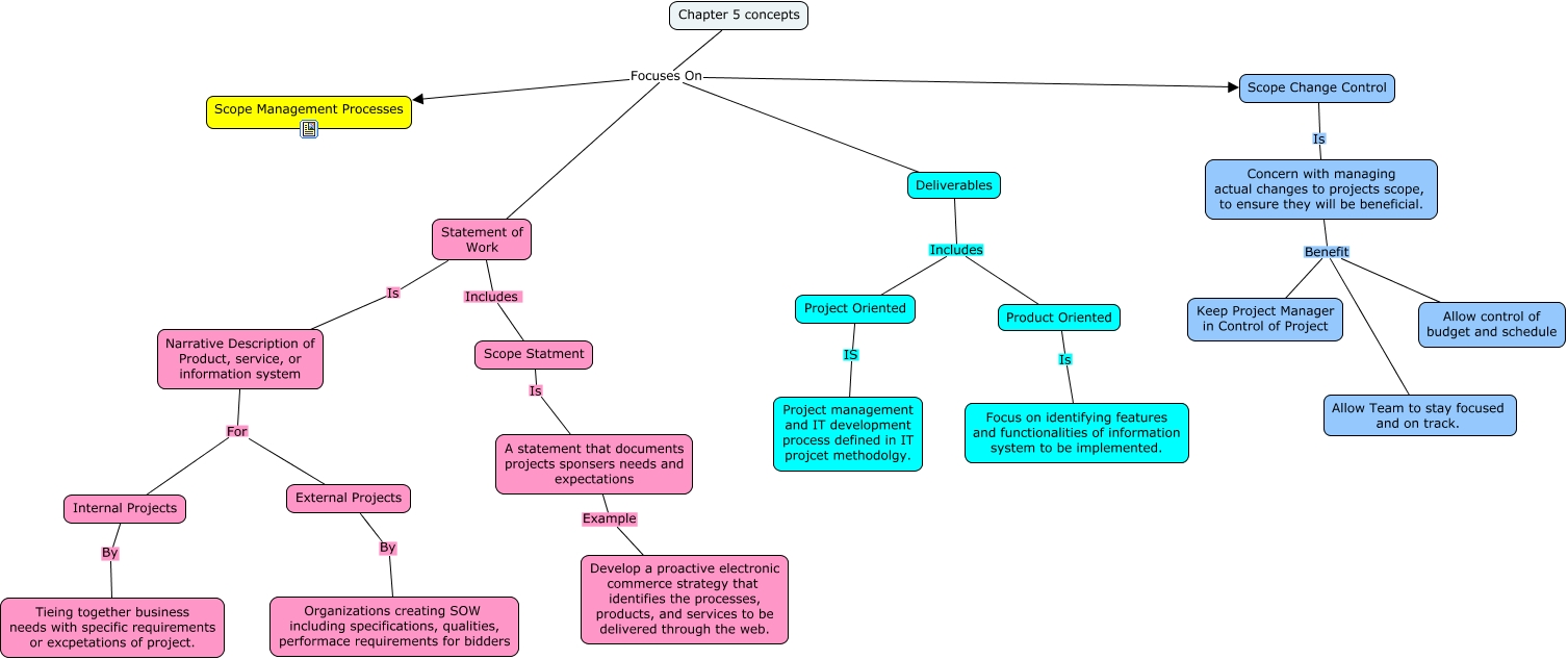 This Concept Map, created with IHMC CmapTools, has information related to: Chapter 5 Main, Chapter 5 concepts Focuses On Scope Management Processes, Concern with managing actual changes to projects scope, to ensure they will be beneficial. Benefit Allow control of budget and schedule, A statement that documents projects sponsers needs and expectations Example Develop a proactive electronic commerce strategy that identifies the processes, products, and services to be delivered through the web., Statement of Work Includes Scope Statment, Project Oriented IS Project management and IT development process defined in IT projcet methodolgy., Narrative Description of Product, service, or information system For External Projects, Chapter 5 concepts Focuses On Deliverables, Deliverables Includes Project Oriented, Scope Statment Is A statement that documents projects sponsers needs and expectations, Concern with managing actual changes to projects scope, to ensure they will be beneficial. Benefit Allow Team to stay focused and on track., Internal Projects By Tieing together business needs with specific requirements or excpetations of project., Chapter 5 concepts Focuses On Statement of Work, Scope Change Control Is Concern with managing actual changes to projects scope, to ensure they will be beneficial., Chapter 5 concepts Focuses On Scope Change Control, Statement of Work Is Narrative Description of Product, service, or information system, Narrative Description of Product, service, or information system For Internal Projects, Deliverables Includes Product Oriented, Concern with managing actual changes to projects scope, to ensure they will be beneficial. Benefit Keep Project Manager in Control of Project, Product Oriented Is Focus on identifying features and functionalities of information system to be implemented., External Projects By Organizations creating SOW including specifications, qualities, performace requirements for bidders