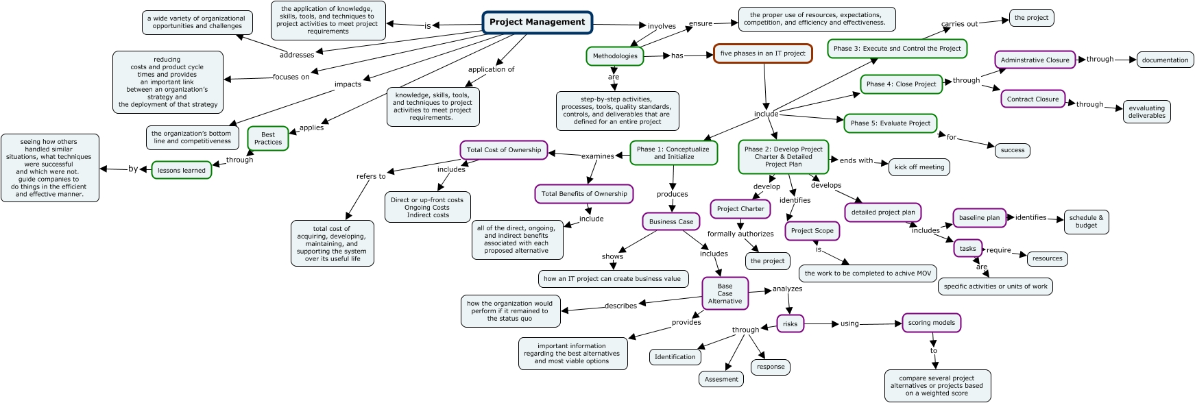 This Concept Map, created with IHMC CmapTools, has information related to: Project Management-- Midterm, detailed project plan includes baseline plan, tasks require resources, lessons learned by seeing how others handled similar situations, what techniques were successful and which were not. guide companies to do things in the efficient and effective manner., baseline plan identifies schedule & budget, five phases in an IT project include Phase 4: Close Project, risks using scoring models, Total Cost of Ownership includes Direct or up-front costs Ongoing Costs Indirect costs, risks through Assesment, five phases in an IT project include Phase 3: Execute snd Control the Project, Project Management focuses on reducing costs and product cycle times and provides an important link between an organization’s strategy and the deployment of that strategy, Project Management applies Best Practices, Project Scope is the work to be completed to achive MOV, Base Case Alternative analyzes risks, Phase 3: Execute snd Control the Project carries out the project, Project Charter formally authorizes the project, five phases in an IT project include Phase 1: Conceptualize and Initialize, Methodologies has five phases in an IT project, Total Benefits of Ownership include all of the direct, ongoing, and indirect benefits associated with each proposed alternative, Project Management is the application of knowledge, skills, tools, and techniques to project activities to meet project requirements, Phase 1: Conceptualize and Initialize examines Total Cost of Ownership