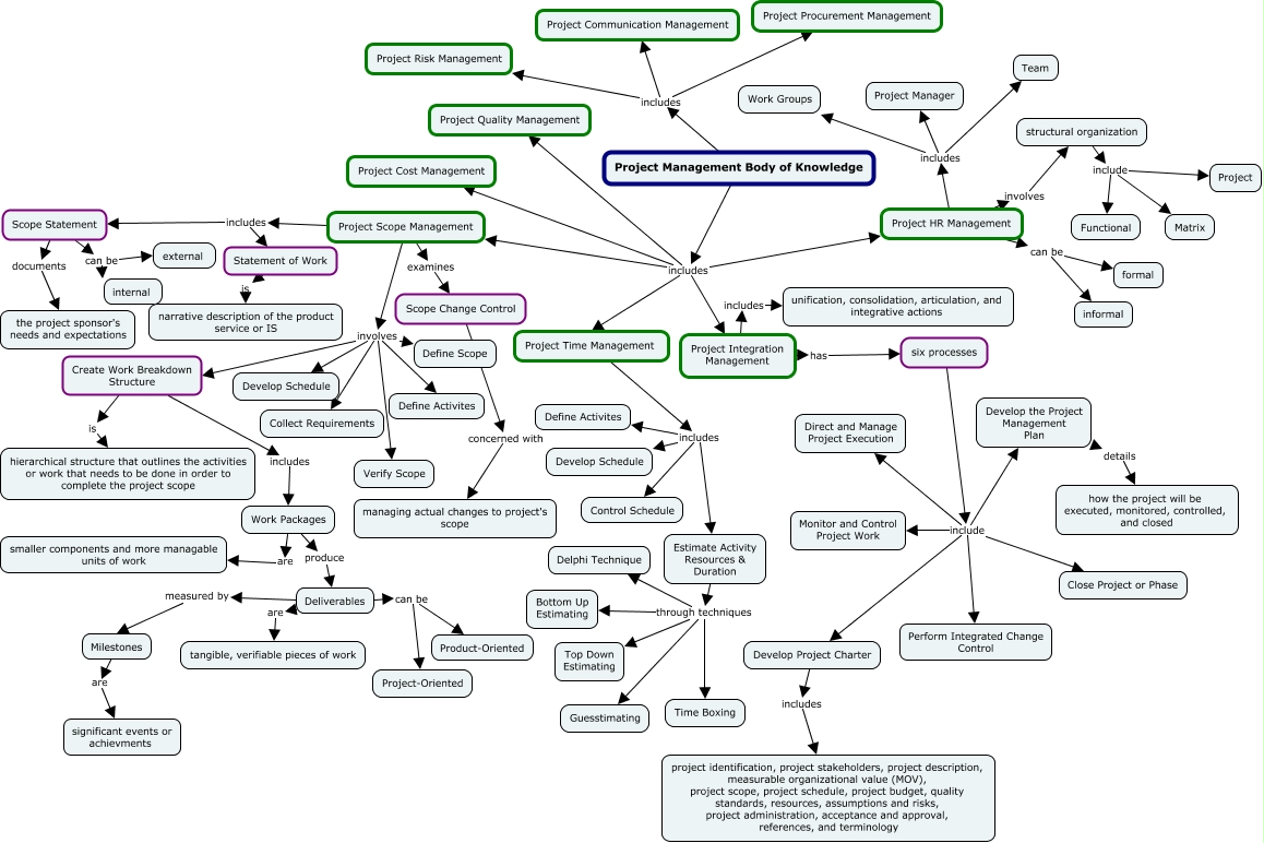 This Concept Map, created with IHMC CmapTools, has information related to: Project Mgt Body of Knowledge-- Midterm, Estimate Activity Resources & Duration through techniques Top Down Estimating, Create Work Breakdown Structure is hierarchical structure that outlines the activities or work that needs to be done in order to complete the project scope, Deliverables measured by Milestones, six processes include Monitor and Control Project Work, Estimate Activity Resources & Duration through techniques Delphi Technique, Scope Statement documents the project sponsor's needs and expectations, Develop Project Charter includes project identification, project stakeholders, project description, measurable organizational value (MOV), project scope, project schedule, project budget, quality standards, resources, assumptions and risks, project administration, acceptance and approval, references, and terminology, Estimate Activity Resources & Duration through techniques Guesstimating, Scope Change Control concerned with managing actual changes to project's scope, Deliverables can be Product-Oriented, structural organization include Project, Project Time Management includes Develop Schedule, Scope Statement can be external, Project HR Management can be informal, Project Management Body of Knowledge includes Project Cost Management, Project Scope Management involves Develop Schedule, Project Scope Management involves Collect Requirements, Work Packages produce Deliverables, Project Scope Management examines Scope Change Control, six processes include Close Project or Phase