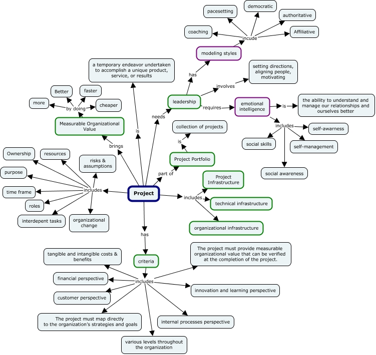 This Concept Map, created with IHMC CmapTools, has information related to: Project-- Midterm, leadership has modeling styles, Project brings Measurable Organizational Value, Measurable Organizational Value by doing Better, modeling styles incude pacesetting, Project includes interdepent tasks, Project Portfolio is collection of projects, emotional intelligence includes social skills, Project includes technical infrastructure, Measurable Organizational Value by doing cheaper, criteria includes tangible and intangible costs & benefits, criteria includes customer perspective, leadership requires emotional intelligence, Measurable Organizational Value by doing more, Project includes purpose, criteria includes financial perspective, emotional intelligence includes social awareness, emotional intelligence includes self-management, criteria includes The project must provide measurable organizational value that can be verified at the completion of the project., Project includes resources, emotional intelligence includes self-awarness