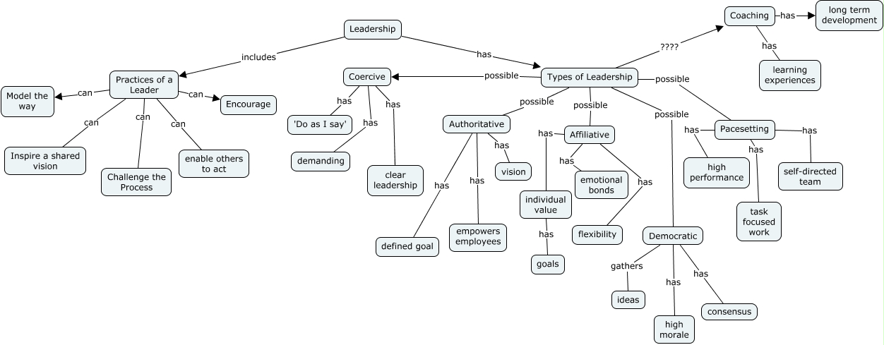 This Concept Map, created with IHMC CmapTools, has information related to: Chapter 13, Practices of a Leader can Challenge the Process, Practices of a Leader can Encourage, Types of Leadership possible Coercive, Practices of a Leader can Model the way, Democratic gathers ideas, Pacesetting has task focused work, Types of Leadership possible Authoritative, Leadership has Types of Leadership, Authoritative has empowers employees, Coercive has clear leadership, Affiliative has individual value, Democratic has consensus, Affiliative has emotional bonds, Types of Leadership possible Democratic, Affiliative has flexibility, Pacesetting has self-directed team, Coercive has 'Do as I say', Democratic has high morale, Leadership includes Practices of a Leader, Authoritative has vision
