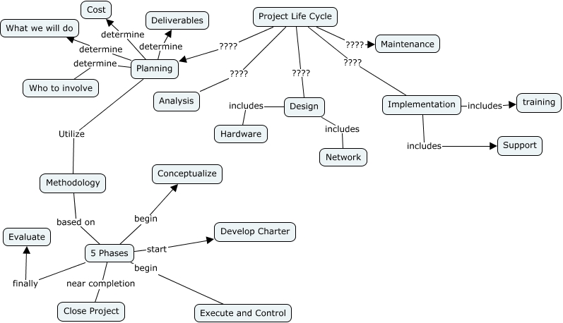 This Concept Map, created with IHMC CmapTools, has information related to: Chapter 2, Methodology based on 5 Phases, Design includes Network, Project Life Cycle ???? Design, Planning determine What we will do, Planning determine Deliverables, Project Life Cycle ???? Implementation, Planning determine Cost, 5 Phases near completion Close Project, 5 Phases finally Evaluate, Implementation includes Support, 5 Phases begin Conceptualize, Planning determine Who to involve, Project Life Cycle ???? Planning, Planning Utilize Methodology, 5 Phases begin Execute and Control, 5 Phases start Develop Charter, Implementation includes training, Project Life Cycle ???? Analysis, Design includes Hardware, Project Life Cycle ???? Maintenance