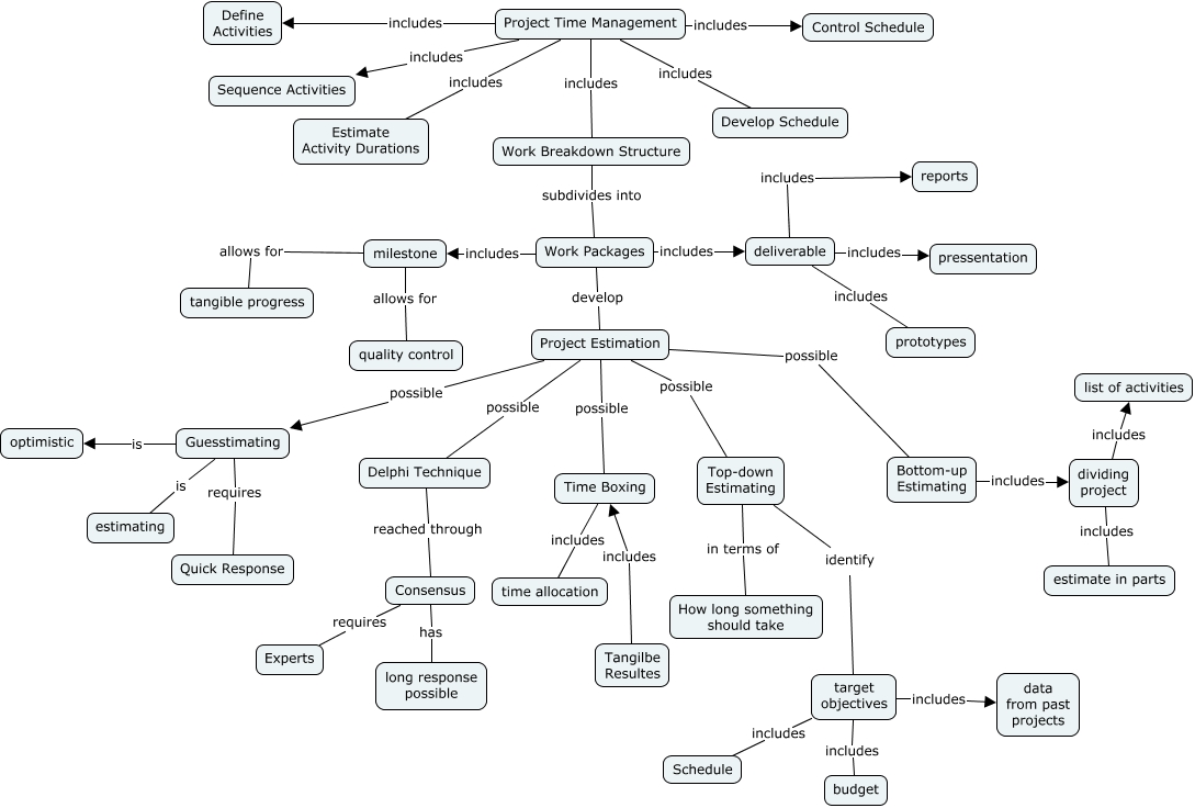 This Concept Map, created with IHMC CmapTools, has information related to: Chapter 6, Project Estimation possible Delphi Technique, dividing project includes list of activities, Project Estimation possible Guesstimating, Project Estimation possible Bottom-up Estimating, Tangilbe Resultes includes Time Boxing, deliverable includes pressentation, Guesstimating is optimistic, Project Time Management includes Work Breakdown Structure, target objectives includes budget, Project Estimation possible Time Boxing, dividing project includes estimate in parts, Work Breakdown Structure subdivides into Work Packages, Bottom-up Estimating includes dividing project, Project Time Management includes Develop Schedule, Guesstimating is estimating, Project Time Management includes Estimate Activity Durations, deliverable includes reports, target objectives includes data from past projects, Top-down Estimating identify target objectives, milestone allows for quality control