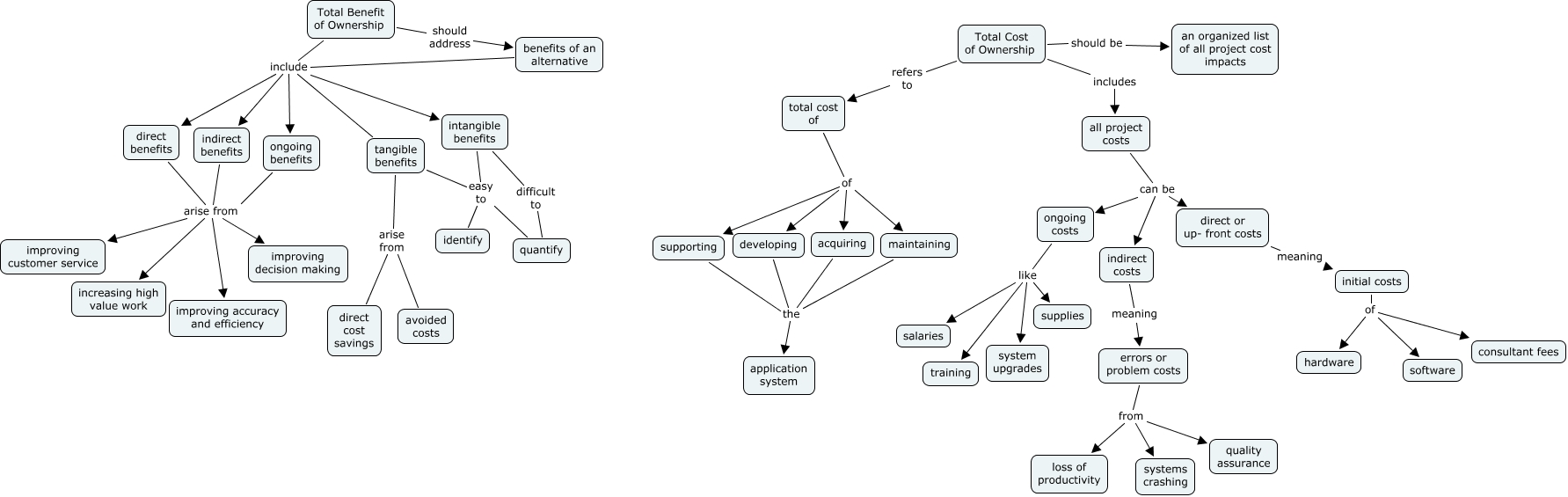This Concept Map, created with IHMC CmapTools, has information related to: TBO and TCO, all project costs can be ongoing costs, initial costs of consultant fees, Total Benefit of Ownership should address benefits of an alternative, total cost of of acquiring, Total Benefit of Ownership include tangible benefits, tangible benefits arise from direct cost savings, errors or problem costs from systems crashing, tangible benefits easy to quantify, direct benefits arise from improving decision making, ongoing costs like supplies, direct benefits arise from improving customer service, all project costs can be direct or up- front costs, benefits of an alternative include direct benefits, Total Cost of Ownership includes all project costs, indirect benefits arise from improving accuracy and efficiency, direct benefits arise from increasing high value work, tangible benefits easy to identify, Total Cost of Ownership refers to total cost of, indirect benefits arise from improving customer service, Total Benefit of Ownership include intangible benefits