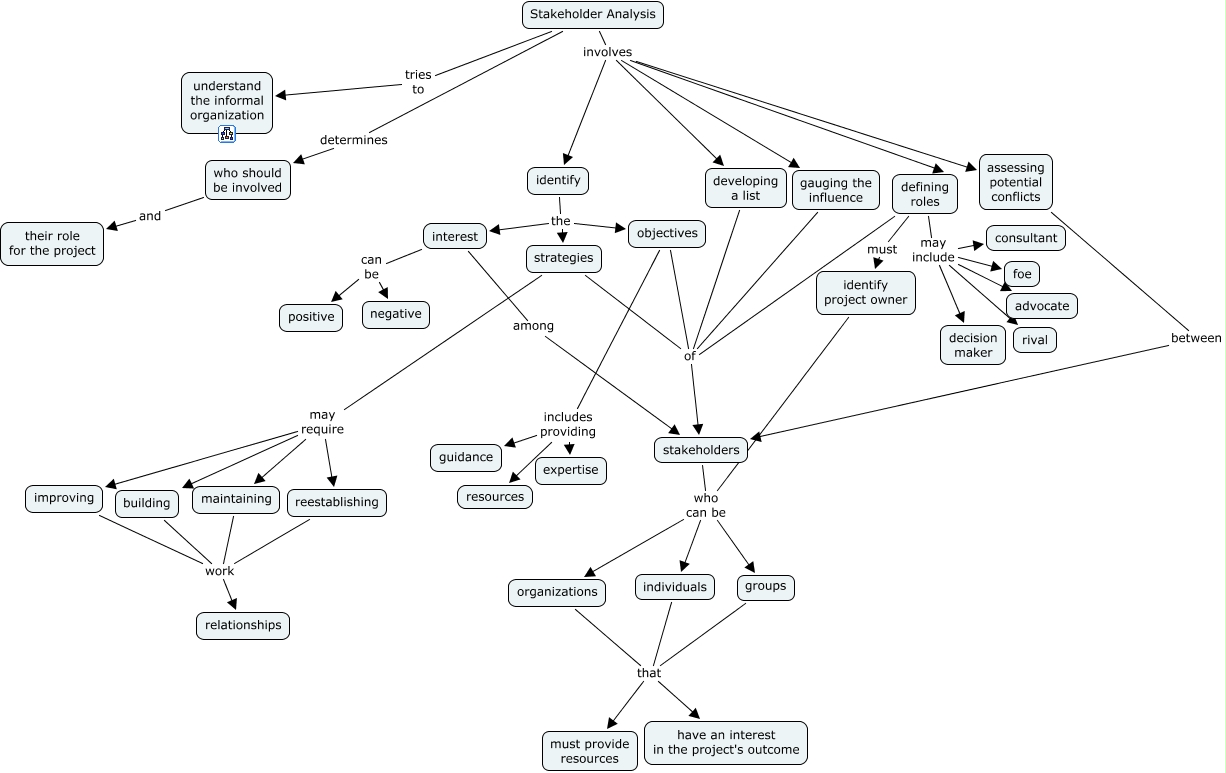 This Concept Map, created with IHMC CmapTools, has information related to: Stakeholder Analysis, who should be involved and their role for the project, organizations that have an interest in the project's outcome, defining roles may include foe, identify project owner who can be individuals, individuals that have an interest in the project's outcome, interest can be positive, strategies of stakeholders, Stakeholder Analysis involves developing a list, defining roles may include advocate, stakeholders who can be individuals, gauging the influence of stakeholders, identify the objectives, defining roles may include consultant, defining roles may include decision maker, interest can be negative, strategies may require building, groups that have an interest in the project's outcome, identify project owner who can be organizations, developing a list of stakeholders, objectives includes providing expertise