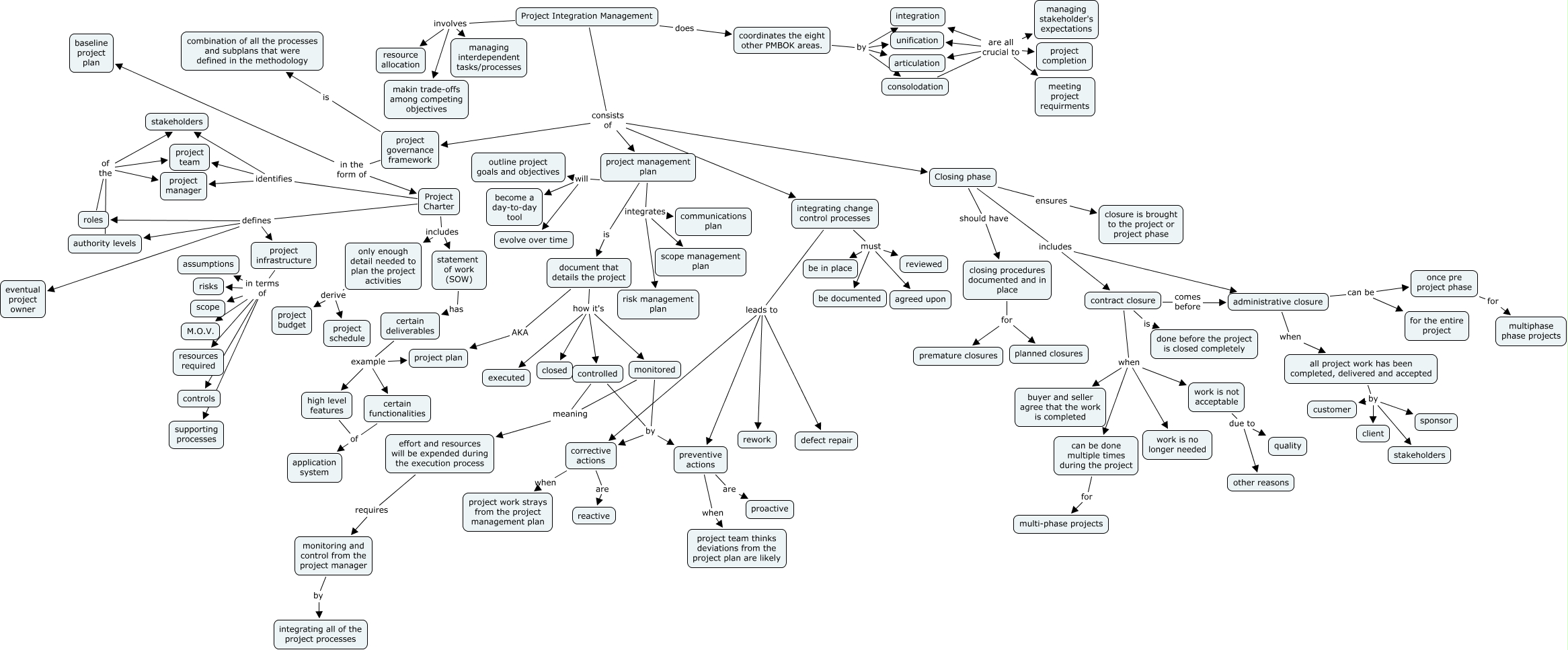 This Concept Map, created with IHMC CmapTools, has information related to: Project Integration Management, can be done multiple times during the project for multi-phase projects, corrective actions are reactive, document that details the project AKA project plan, integrating change control processes leads to rework, certain deliverables example project plan, Project Charter defines eventual project owner, project infrastructure in terms of risks, Project Integration Management consists of Closing phase, contract closure is done before the project is closed completely, all project work has been completed, delivered and accepted by customer, project management plan integrates communications plan, integrating change control processes leads to defect repair, Project Charter identifies project team, integrating change control processes leads to preventive actions, project infrastructure in terms of assumptions, consolodation are all crucial to unification, contract closure when buyer and seller agree that the work is completed, Project Charter defines roles, consolodation are all crucial to integration, only enough detail needed to plan the project activities derive project budget