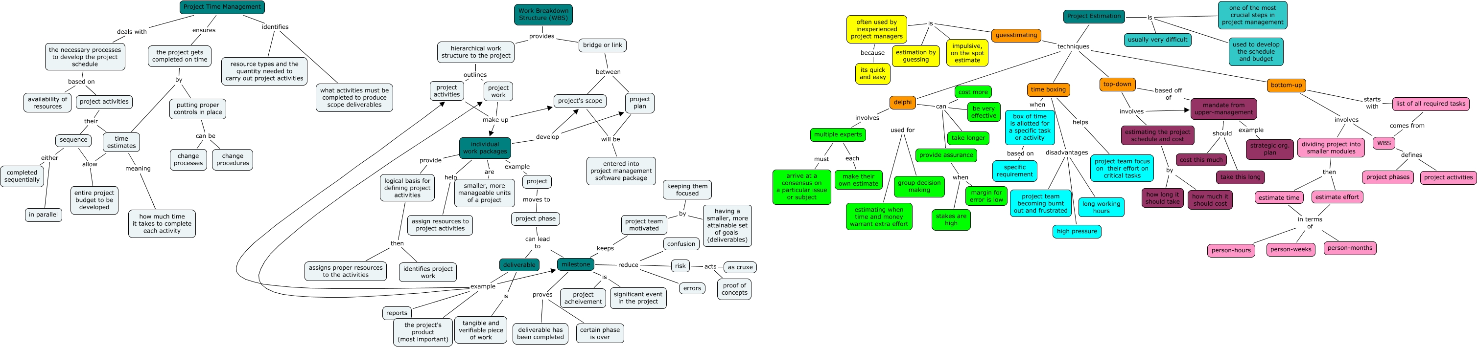 This Concept Map, created with IHMC CmapTools, has information related to: ch. 6, delphi used for group decision making, top-down involves estimating the project schedule and cost, milestone keeps project team motivated, project's scope will be entered into project management software package, often used by inexperienced project managers because its quick and easy, project phase can lead to deliverable, bridge or link between project plan, deliverable example project work, Project Time Management deals with the necessary processes to develop the project schedule, project work make up individual work packages, estimating the project schedule and cost by how much it should cost, delphi can provide assurance, the necessary processes to develop the project schedule based on project activities, project phase can lead to milestone, provide assurance when margin for error is low, mandate from upper-management example strategic org. plan, bottom-up starts with list of all required tasks, delphi used for estimating when time and money warrant extra effort, milestone reduce errors, estimate time in terms of person-weeks