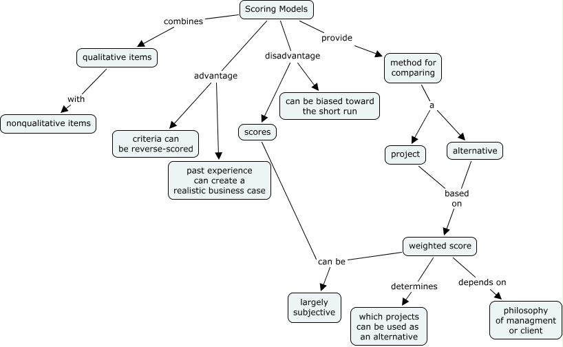 This Concept Map, created with IHMC CmapTools, has information related to: Scoring Models, alternative based on weighted score, method for comparing a project, weighted score depends on philosophy of managment or client, weighted score determines which projects can be used as an alternative, project based on weighted score, Scoring Models provide method for comparing, scores can be largely subjective, method for comparing a alternative, weighted score can be largely subjective, Scoring Models disadvantage can be biased toward the short run, Scoring Models combines qualitative items, Scoring Models disadvantage scores, Scoring Models advantage past experience can create a realistic business case, qualitative items with nonqualitative items, Scoring Models advantage criteria can be reverse-scored