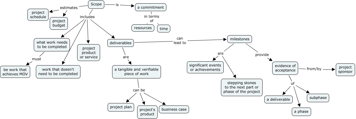 This Concept Map, created with IHMC CmapTools, has information related to: Scope, Scope is a commitment, a tangible and verifiable piece of work can be business case, Scope estimates project schedule, Scope estimates project budget, a commitment in terms of resources, deliverables are a tangible and verifiable piece of work, evidence of acceptance of a deliverable, what work needs to be completed must be work that achieves MOV, a tangible and verifiable piece of work can be project plan, Scope includes project product or service, deliverables can lead to milestones, Scope includes work that doesn't need to be completed, evidence of acceptance of subphase, Scope includes what work needs to be completed, milestones are stepping stones to the next part or phase of the project, milestones provide evidence of acceptance, evidence of acceptance of a phase, a tangible and verifiable piece of work can be project's product, a commitment in terms of time, evidence of acceptance from/by project sponsor