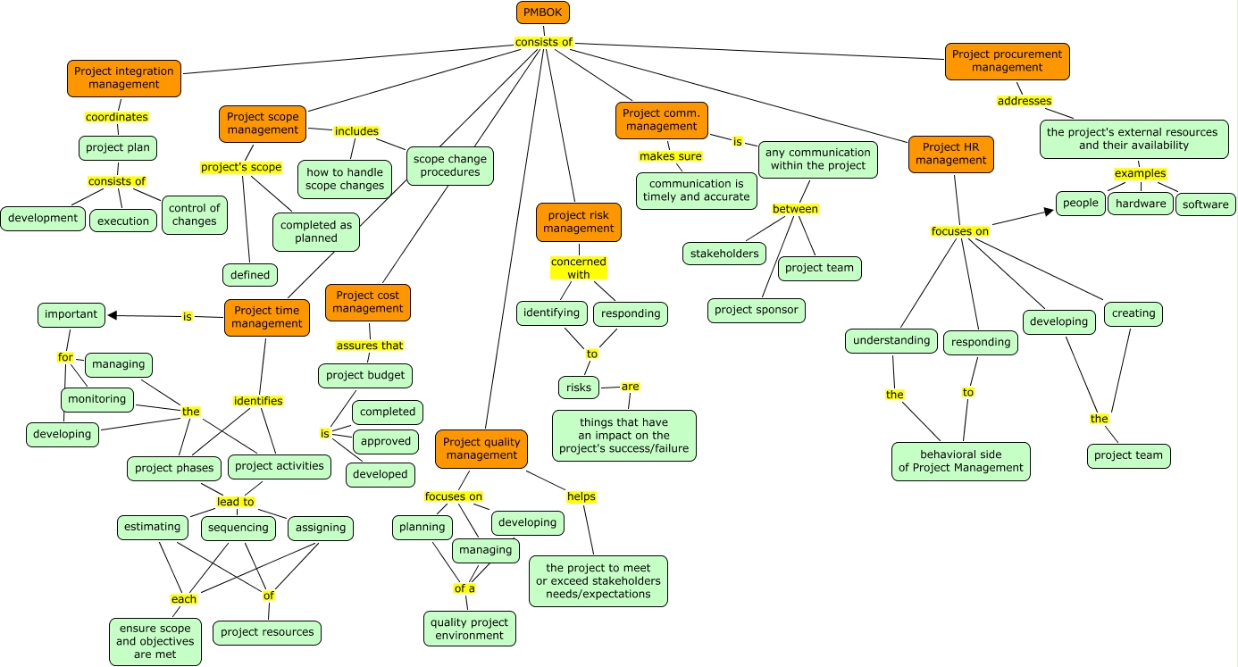 This Concept Map, created with IHMC CmapTools, has information related to: PMBOK, responding to behavioral side of Project Management, estimating of sequencing, Project HR management focuses on people, Project comm. management is any communication within the project, monitoring the project activities, Project integration management coordinates project plan, Project scope management includes scope change procedures, important for managing, project phases lead to assigning, Project scope management project's scope completed as planned, Project time management identifies project phases, project phases lead to project activities, PMBOK consists of Project HR management, any communication within the project between project sponsor, Project quality management focuses on planning, project budget is completed, important for developing, any communication within the project between stakeholders, PMBOK consists of Project comm. management, PMBOK consists of Project time management