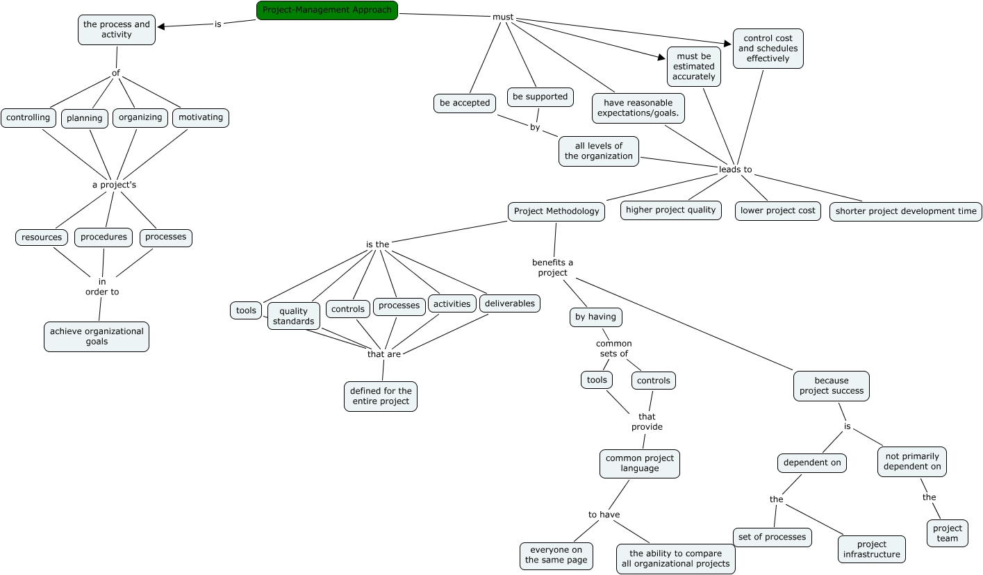 This Concept Map, created with IHMC CmapTools, has information related to: Project Management Approach, Project-Management Approach must must be estimated accurately, the process and activity of controlling, activities that are defined for the entire project, dependent on the set of processes, Project Methodology is the tools, resources in order to achieve organizational goals, because project success is dependent on, motivating a project's resources, by having common sets of controls, all levels of the organization leads to shorter project development time, Project-Management Approach must be supported, control cost and schedules effectively leads to lower project cost, all levels of the organization leads to higher project quality, be supported by all levels of the organization, Project-Management Approach is the process and activity, must be estimated accurately leads to Project Methodology, all levels of the organization leads to Project Methodology, must be estimated accurately leads to higher project quality, Project Methodology is the controls, control cost and schedules effectively leads to Project Methodology