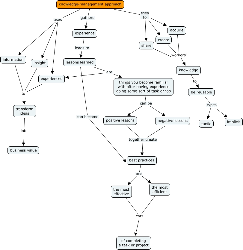 This Concept Map, created with IHMC CmapTools, has information related to: Knowledge Management Approach, acquire workers' knowledge, things you become familiar with after having experience doing some sort of task or job can be negative lessons, lessons learned can become best practices, insight to transform ideas, be reusable types implicit, create workers' knowledge, knowledge-management approach uses insight, experiences to transform ideas, knowledge to be reusable, be reusable types tactic, experience leads to lessons learned, knowledge-management approach uses information, positive lessons together create best practices, the most effective way of completing a task or project, things you become familiar with after having experience doing some sort of task or job can be positive lessons, knowledge-management approach tries to share, knowledge-management approach gathers experience, knowledge-management approach uses experiences, lessons learned are things you become familiar with after having experience doing some sort of task or job, lessons learned are experiences