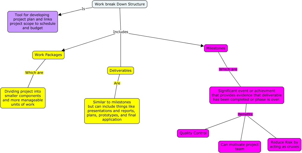This Concept Map, created with IHMC CmapTools, has information related to: Chapter 6 Work Break Down Structure, Significant event or achievment that provides evidence that deliverable has been completed or phase is over. Benefits Can motivate project team, Work break Down Structure Is Tool for developing project plan and links project scope to schedule and budget, Work break Down Structure Includes Work Packages, Milestones Which are Significant event or achievment that provides evidence that deliverable has been completed or phase is over., Significant event or achievment that provides evidence that deliverable has been completed or phase is over. Benefits Reduce Risk by acting as cruxes, Work Packages Which are Dividing project into smaller components and more manageable units of work, Significant event or achievment that provides evidence that deliverable has been completed or phase is over. Benefits Quality Control, Deliverables Are Similar to milestones but can include things like presentations and reports, plans, prototypes, and final application, Work break Down Structure Includes Deliverables, Work break Down Structure Includes Milestones