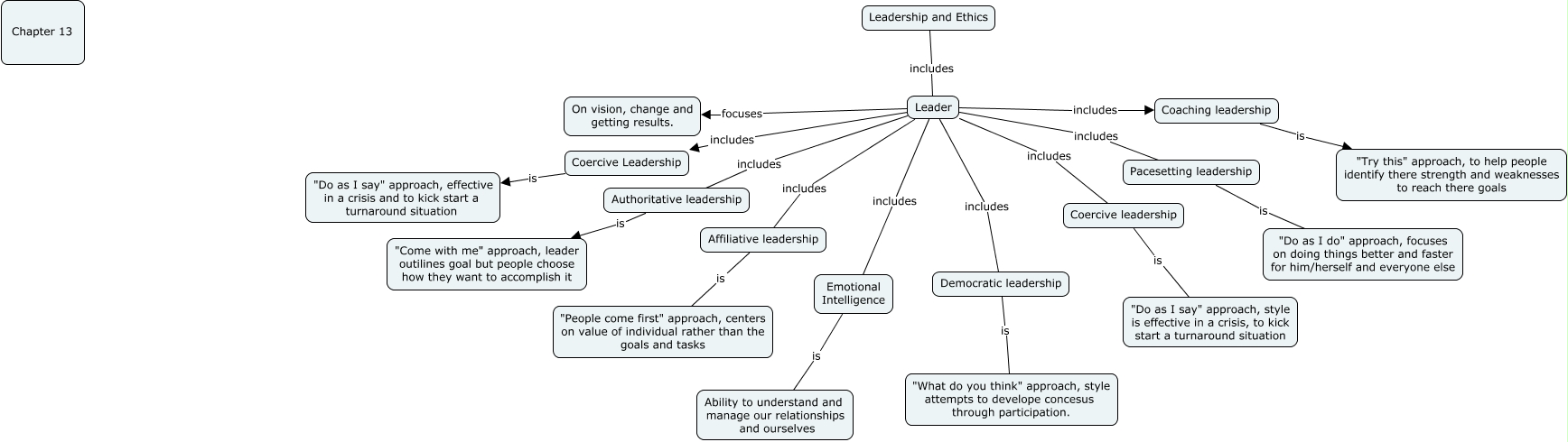 This Concept Map, created with IHMC CmapTools, has information related to: CHAPTER 13, Leader includes Coercive Leadership, Leader includes Coercive leadership, Leader includes Democratic leadership, Leader includes Authoritative leadership, Leader focuses On vision, change and getting results., Democratic leadership is "What do you think" approach, style attempts to develope concesus through participation., Leader includes Emotional Intelligence, Affiliative leadership is "People come first" approach, centers on value of individual rather than the goals and tasks, Authoritative leadership is "Come with me" approach, leader outilines goal but people choose how they want to accomplish it, Coercive Leadership is "Do as I say" approach, effective in a crisis and to kick start a turnaround situation, Coaching leadership is "Try this" approach, to help people identify there strength and weaknesses to reach there goals, Leader includes Coaching leadership, Emotional Intelligence is Ability to understand and manage our relationships and ourselves, Leader includes Pacesetting leadership, Leader includes Affiliative leadership, Coercive leadership is "Do as I say" approach, style is effective in a crisis, to kick start a turnaround situation, Pacesetting leadership is "Do as I do" approach, focuses on doing things better and faster for him/herself and everyone else, Leadership and Ethics includes Leader