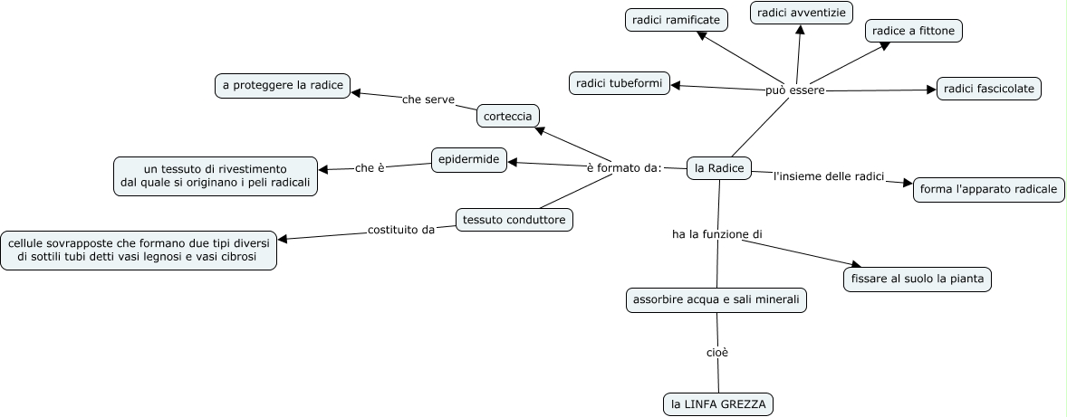 Questa Cmap, creata con IHMC CmapTools, contiene informazioni relative a: la radice, la Radice l'insieme delle radici forma l'apparato radicale, la Radice può essere radice a fittone, la Radice ha la funzione di fissare al suolo la pianta, la Radice è formato da: corteccia, la Radice può essere radici avventizie, la Radice può essere radici fascicolate, la Radice è formato da: tessuto conduttore, tessuto conduttore costituito da cellule sovrapposte che formano due tipi diversi di sottili tubi detti vasi legnosi e vasi cibrosi, la Radice è formato da: epidermide, la Radice ha la funzione di assorbire acqua e sali minerali, epidermide che è un tessuto di rivestimento dal quale si originano i peli radicali, la Radice può essere radici tubeformi, assorbire acqua e sali minerali cioè la LINFA GREZZA, la Radice può essere radici ramificate, corteccia che serve a proteggere la radice