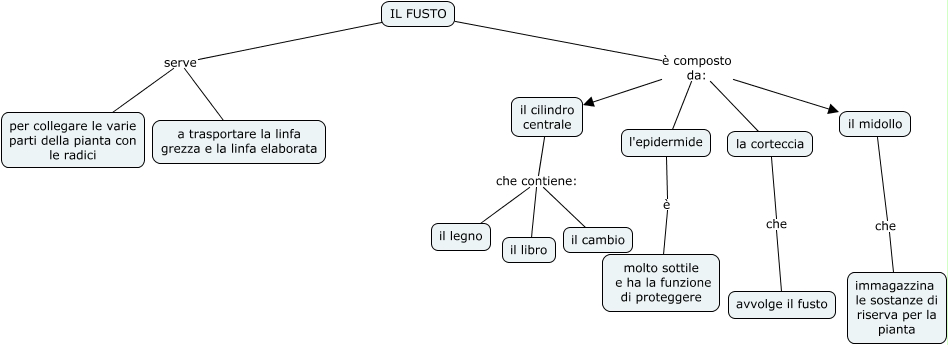 Questa Cmap, creata con IHMC CmapTools, contiene informazioni relative a: il fusto, IL FUSTO è composto da: la corteccia, IL FUSTO serve a trasportare la linfa grezza e la linfa elaborata, il midollo che immagazzina le sostanze di riserva per la pianta, l'epidermide è molto sottile e ha la funzione di proteggere, il cilindro centrale che contiene: il cambio, IL FUSTO è composto da: il cilindro centrale, IL FUSTO è composto da: l'epidermide, IL FUSTO serve per collegare le varie parti della pianta con le radici, la corteccia che avvolge il fusto, IL FUSTO è composto da: il midollo, il cilindro centrale che contiene: il libro, il cilindro centrale che contiene: il legno