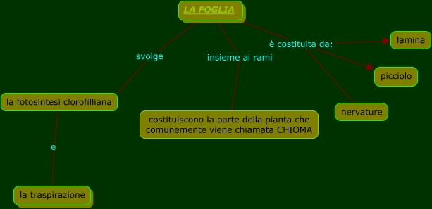 Questa Cmap, creata con IHMC CmapTools, contiene informazioni relative a: la Foglia, LA FOGLIA è costituita da: nervature, la fotosintesi clorofilliana e la traspirazione, LA FOGLIA è costituita da: picciolo, LA FOGLIA insieme ai rami costituiscono la parte della pianta che comunemente viene chiamata CHIOMA, LA FOGLIA è costituita da: lamina, LA FOGLIA svolge la fotosintesi clorofilliana