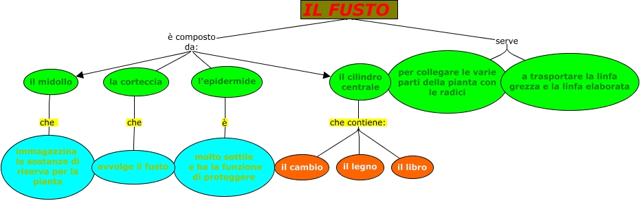 Questa Cmap, creata con IHMC CmapTools, contiene informazioni relative a: il fusto, IL FUSTO è composto da: la corteccia, IL FUSTO serve a trasportare la linfa grezza e la linfa elaborata, il midollo che immagazzina le sostanze di riserva per la pianta, l'epidermide è molto sottile e ha la funzione di proteggere, il cilindro centrale che contiene: il cambio, IL FUSTO è composto da: il cilindro centrale, IL FUSTO è composto da: l'epidermide, IL FUSTO serve per collegare le varie parti della pianta con le radici, la corteccia che avvolge il fusto, IL FUSTO è composto da: il midollo, il cilindro centrale che contiene: il libro, il cilindro centrale che contiene: il legno