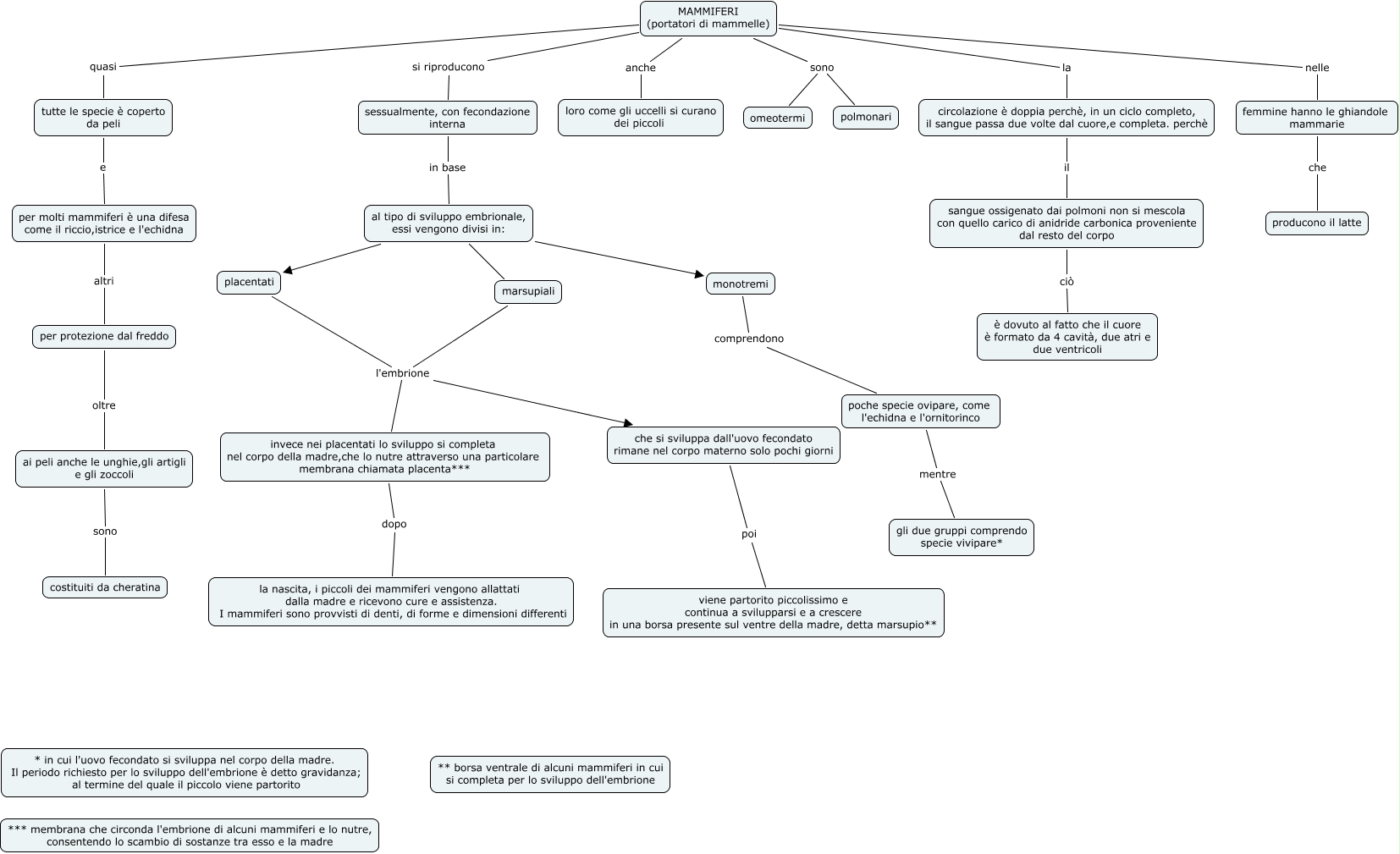 Questa Cmap, creata con IHMC CmapTools, contiene informazioni relative a: Mammiferi, femmine hanno le ghiandole mammarie che producono il latte, MAMMIFERI (portatori di mammelle) anche loro come gli uccelli si curano dei piccoli, MAMMIFERI (portatori di mammelle) quasi tutte le specie è coperto da peli, al tipo di sviluppo embrionale, essi vengono divisi in: monotremi, per molti mammiferi è una difesa come il riccio,istrice e l'echidna altri per protezione dal freddo, poche specie ovipare, come l'echidna e l'ornitorinco mentre gli due gruppi comprendo specie vivipare*, MAMMIFERI (portatori di mammelle) si riproducono sessualmente, con fecondazione interna, sessualmente, con fecondazione interna in base al tipo di sviluppo embrionale, essi vengono divisi in:, placentati l'embrione invece nei placentati lo sviluppo si completa nel corpo della madre,che lo nutre attraverso una particolare membrana chiamata placenta***, tutte le specie è coperto da peli e per molti mammiferi è una difesa come il riccio,istrice e l'echidna, circolazione è doppia perchè, in un ciclo completo, il sangue passa due volte dal cuore,e completa. perchè il sangue ossigenato dai polmoni non si mescola con quello carico di anidride carbonica proveniente dal resto del corpo, marsupiali l'embrione invece nei placentati lo sviluppo si completa nel corpo della madre,che lo nutre attraverso una particolare membrana chiamata placenta***, MAMMIFERI (portatori di mammelle) sono polmonari, marsupiali l'embrione che si sviluppa dall'uovo fecondato rimane nel corpo materno solo pochi giorni, per protezione dal freddo oltre ai peli anche le unghie,gli artigli e gli zoccoli, MAMMIFERI (portatori di mammelle) la circolazione è doppia perchè, in un ciclo completo, il sangue passa due volte dal cuore,e completa. perchè, che si sviluppa dall'uovo fecondato rimane nel corpo materno solo pochi giorni poi viene partorito piccolissimo e continua a svilupparsi e a crescere in una borsa presente sul ventre della madre, detta marsupio**, MAMMIFERI (portatori di mammelle) sono omeotermi, placentati l'embrione che si sviluppa dall'uovo fecondato rimane nel corpo materno solo pochi giorni, MAMMIFERI (portatori di mammelle) nelle femmine hanno le ghiandole mammarie