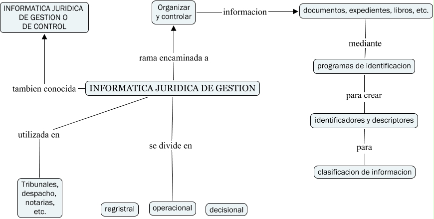Este Cmap, tiene información relacionada con: informatica juridica de gestion, identificadores y descriptores para clasificacion de informacion, INFORMATICA JURIDICA DE GESTION tambien conocida INFORMATICA JURIDICA DE GESTION O DE CONTROL, programas de identificacion para crear identificadores y descriptores, documentos, expedientes, libros, etc. mediante programas de identificacion, INFORMATICA JURIDICA DE GESTION rama encaminada a Organizar y controlar, INFORMATICA JURIDICA DE GESTION utilizada en Tribunales, despacho, notarias, etc., Organizar y controlar informacion documentos, expedientes, libros, etc., INFORMATICA JURIDICA DE GESTION se divide en operacional