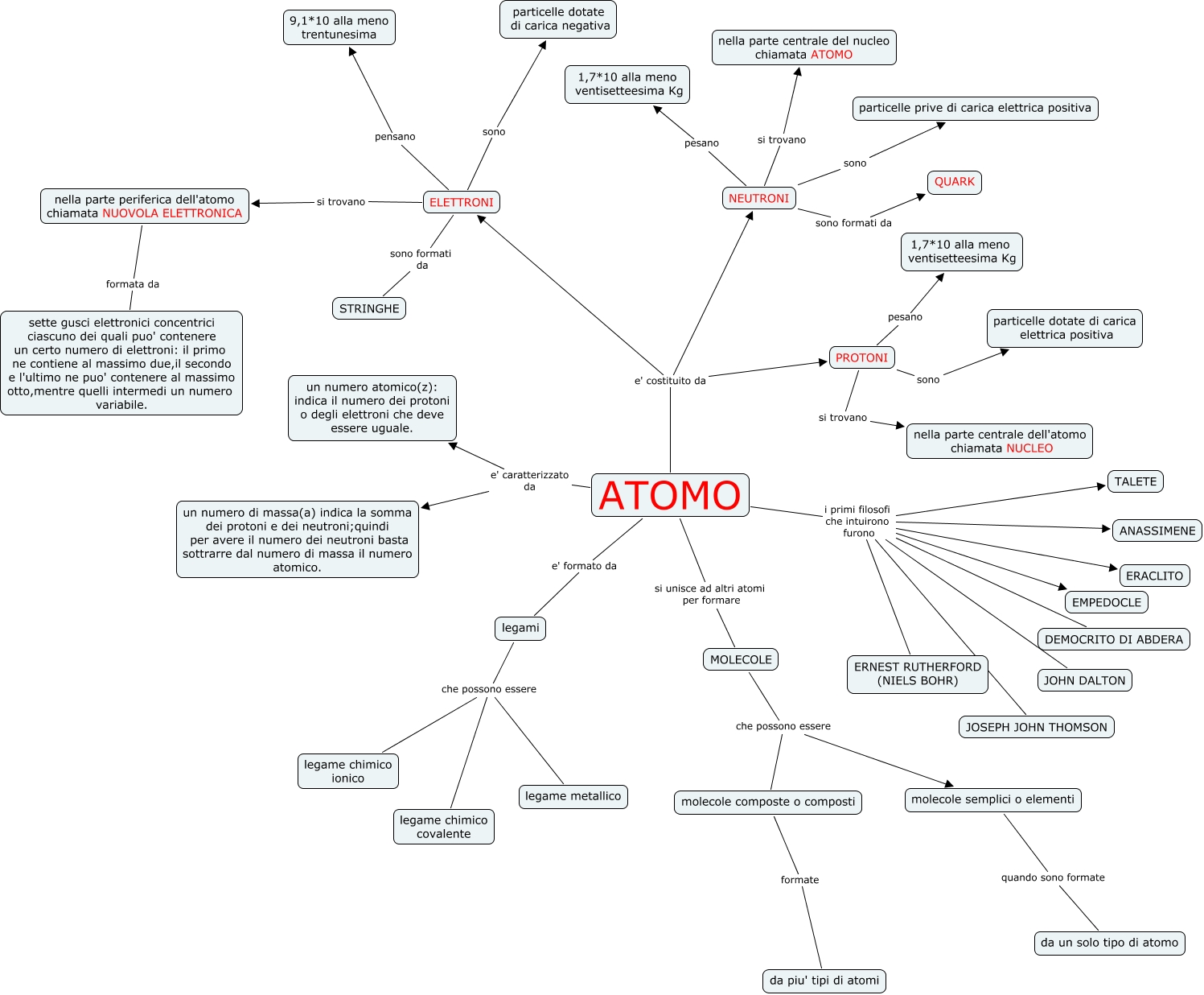 This Concept Map, created with IHMC CmapTools, has information related to: ATOMO, ATOMO e' costituito da NEUTRONI, NEUTRONI sono particelle prive di carica elettrica positiva, molecole semplici o elementi quando sono formate da un solo tipo di atomo, PROTONI sono particelle dotate di carica elettrica positiva, ATOMO si unisce ad altri atomi per formare MOLECOLE, ELETTRONI pensano 9,1*10 alla meno trentunesima, ATOMO i primi filosofi che intuirono furono ANASSIMENE, ATOMO i primi filosofi che intuirono furono EMPEDOCLE, MOLECOLE che possono essere molecole composte o composti, NEUTRONI pesano 1,7*10 alla meno ventisetteesima Kg, ATOMO i primi filosofi che intuirono furono JOHN DALTON, legami che possono essere legame metallico, ATOMO e' costituito da PROTONI, ATOMO i primi filosofi che intuirono furono TALETE, NEUTRONI sono formati da QUARK, PROTONI pesano 1,7*10 alla meno ventisetteesima Kg, ATOMO e' caratterizzato da un numero atomico(z): indica il numero dei protoni o degli elettroni che deve essere uguale., ELETTRONI si trovano nella parte periferica dell'atomo chiamata NUOVOLA ELETTRONICA, ATOMO e' costituito da ELETTRONI, NEUTRONI si trovano nella parte centrale del nucleo chiamata ATOMO