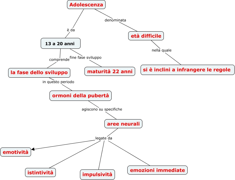 Questa Cmap, creata con IHMC CmapTools, contiene informazioni relative a: adolescenza GAB, aree neurali legate da impulsività, 13 a 20 anni fine fase sviluppo maturità 22 anni, ormoni della pubertà agiscono su specifiche aree neurali, aree neurali legate da istintività, aree neurali legate da emotività, 13 a 20 anni comprende la fase dello sviluppo, la fase dello sviluppo in questo periodo ormoni della pubertà, Adolescenza denominata età difficile, età difficile nella quale si è inclini a infrangere le regole, aree neurali legate da emozioni immediate, Adolescenza è da 13 a 20 anni