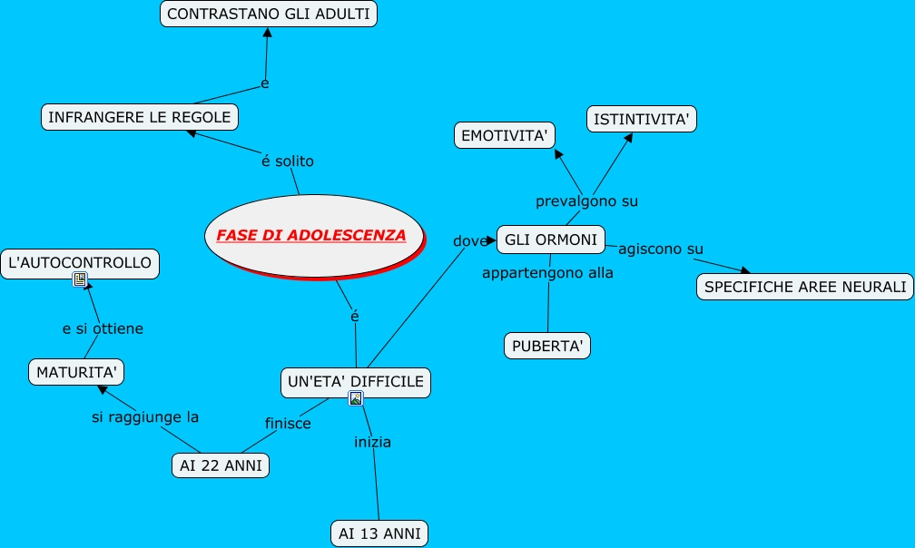 Questa Cmap, creata con IHMC CmapTools, contiene informazioni relative a: Adolescenza STELLA, UN'ETA' DIFFICILE dove GLI ORMONI, MATURITA' e si ottiene L'AUTOCONTROLLO, UN'ETA' DIFFICILE inizia AI 13 ANNI, AI 22 ANNI si raggiunge la MATURITA', INFRANGERE LE REGOLE e CONTRASTANO GLI ADULTI, GLI ORMONI appartengono alla PUBERTA', GLI ORMONI agiscono su SPECIFICHE AREE NEURALI, UN'ETA' DIFFICILE finisce AI 22 ANNI, GLI ORMONI prevalgono su EMOTIVITA', FASE DI ADOLESCENZA é solito INFRANGERE LE REGOLE, GLI ORMONI prevalgono su ISTINTIVITA', FASE DI ADOLESCENZA é UN'ETA' DIFFICILE