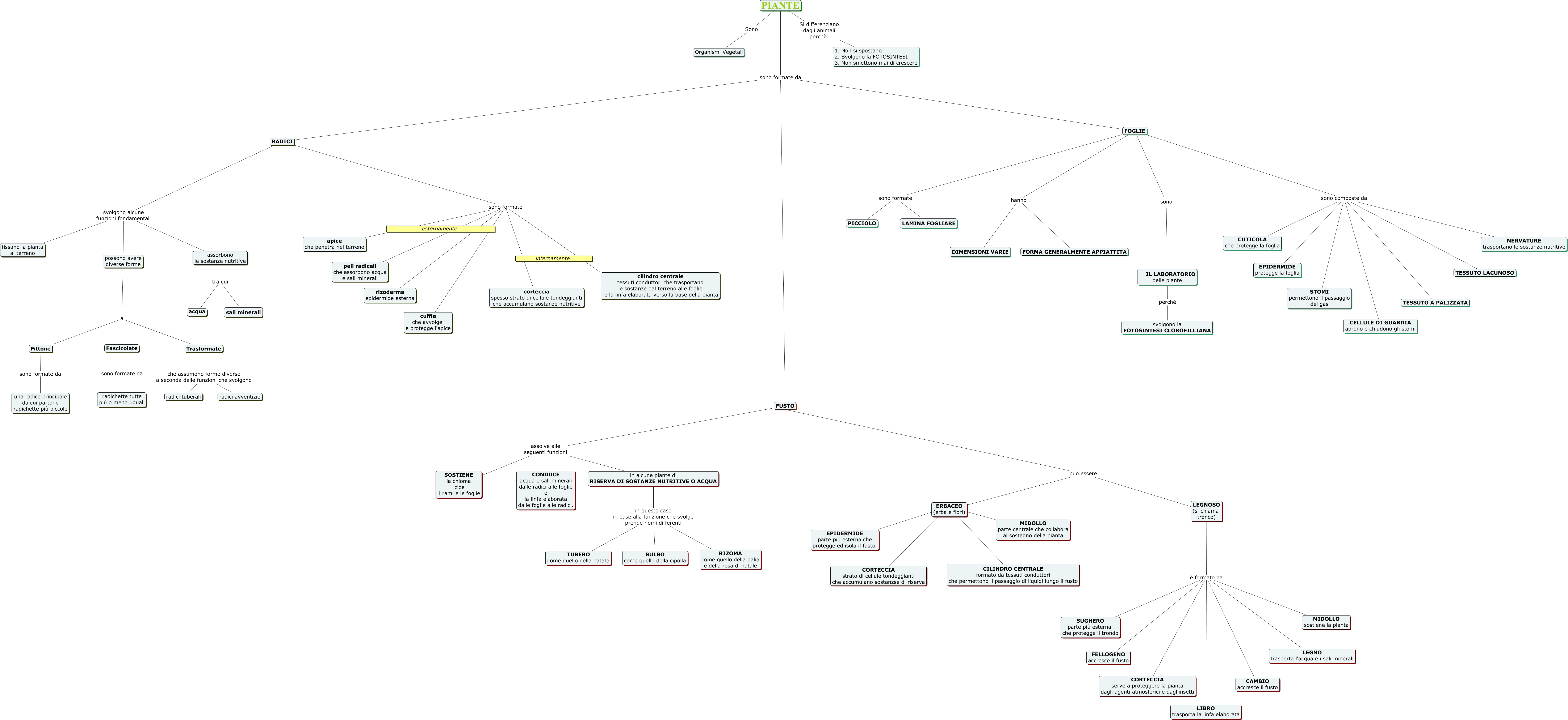 Questa Cmap, creata con IHMC CmapTools, contiene informazioni relative a: Le Piante, LEGNOSO (si chiama tronco) è formato da CAMBIO accresce il fusto, FOGLIE hanno DIMENSIONI VARIE, FOGLIE sono composte da CUTICOLA che protegge la foglia, LEGNOSO (si chiama tronco) è formato da SUGHERO parte più esterna che protegge il trondo, FOGLIE sono formate PICCIOLO, possono avere diverse forme a Fittone, FOGLIE sono composte da CELLULE DI GUARDIA aprono e chiudono gli stomi, RADICI sono formate cilindro centrale tessuti conduttori che trasportano le sostanze dal terreno alle foglie e la linfa elaborata verso la base della pianta, possono avere diverse forme a Fascicolate, PIANTE Si differenziano dagli animali perchè: 1. Non si spostano 2. Svolgono la FOTOSINTESI 3. Non smettono mai di crescere, RADICI sono formate cuffia che avvolge e protegge l'apice, Fascicolate sono formate da radichette tutte più o meno uguali, RADICI sono formate rizoderma epidermide esterna, ERBACEO (erba e fiori) è formato da CORTECCIA strato di cellule tondeggianti che accumulano sostanzse di riserva, PIANTE sono formate da FOGLIE, FOGLIE sono composte da EPIDERMIDE protegge la foglia, FOGLIE sono formate LAMINA FOGLIARE, PIANTE sono formate da FUSTO, FUSTO assolve alle seguenti funzioni SOSTIENE la chioma cioè i rami e le foglie, Trasformate che assumono forme diverse a seconda delle funzioni che svolgono radici tuberali