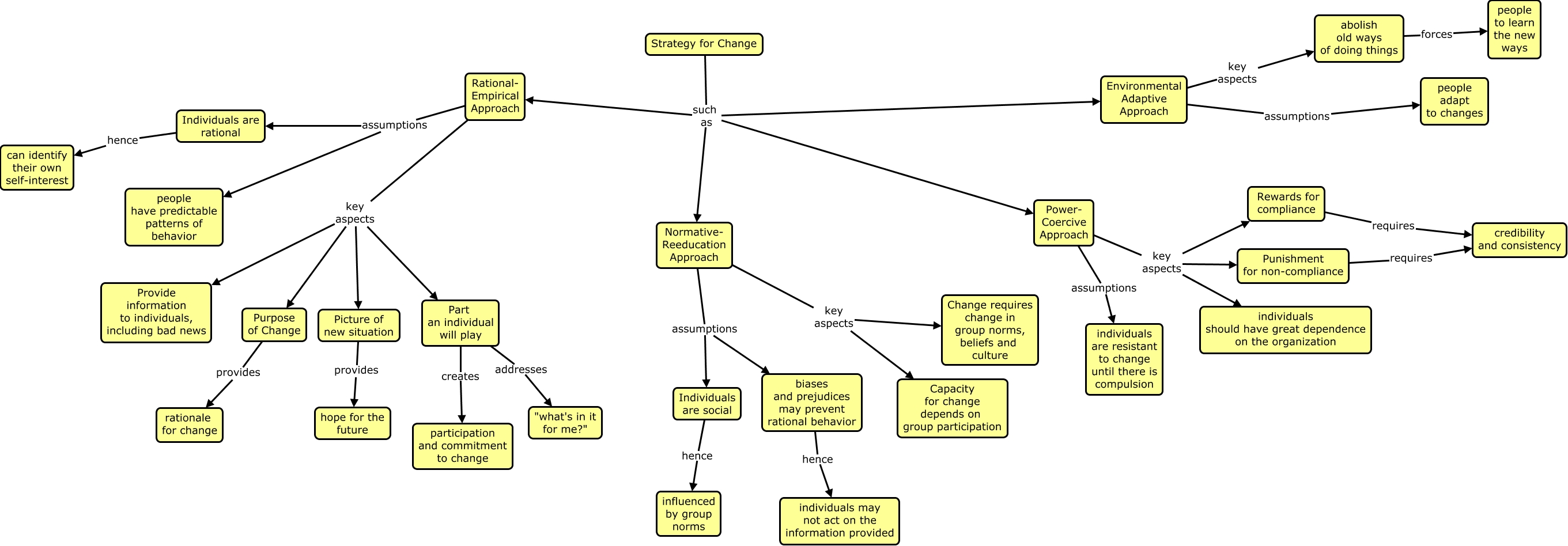 This Concept Map, created with IHMC CmapTools, has information related to: Strategies for change, Rational- Empirical Approach key aspects Picture of new situation, Strategy for Change such as Power- Coercive Approach, biases and prejudices may prevent rational behavior hence individuals may not act on the information provided, Normative- Reeducation Approach key aspects Change requires change in group norms, beliefs and culture, Rational- Empirical Approach key aspects Provide information to individuals, including bad news, Power- Coercive Approach assumptions individuals are resistant to change until there is compulsion, Purpose of Change provides rationale for change, Individuals are social hence influenced by group norms, Power- Coercive Approach key aspects Rewards for compliance, Power- Coercive Approach key aspects individuals should have great dependence on the organization, Punishment for non-compliance requires credibility and consistency, Strategy for Change such as Environmental Adaptive Approach, Environmental Adaptive Approach key aspects abolish old ways of doing things, abolish old ways of doing things forces people to learn the new ways, Part an individual will play addresses "what's in it for me?", Strategy for Change such as Normative- Reeducation Approach, Rational- Empirical Approach assumptions Individuals are rational, Rational- Empirical Approach key aspects Purpose of Change, Rational- Empirical Approach key aspects Part an individual will play, Environmental Adaptive Approach assumptions people adapt to changes