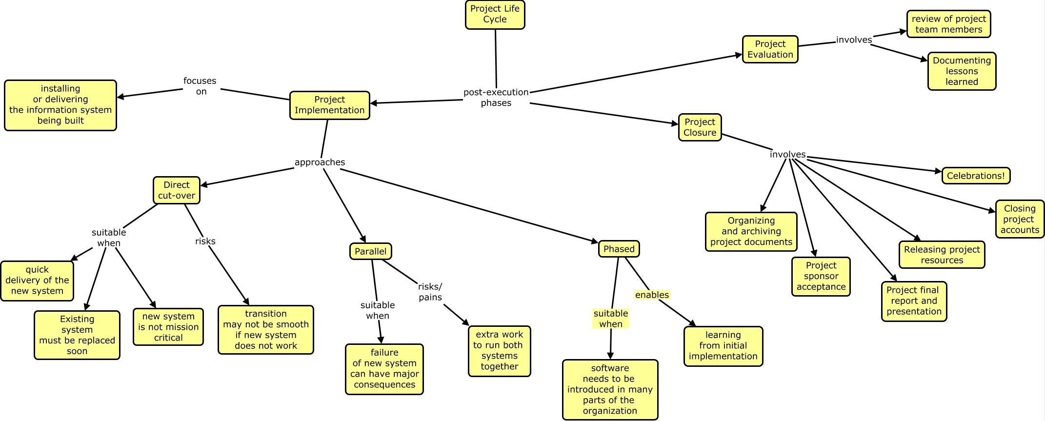This Concept Map, created with IHMC CmapTools, has information related to: Project Implementation Closure and Evaluation, Project Life Cycle post-execution phases Project Evaluation, Project Implementation approaches Parallel, Phased enables learning from initial implementation, Direct cut-over risks transition may not be smooth if new system does not work, Project Implementation approaches Phased, Project Life Cycle post-execution phases Project Closure, Project Life Cycle post-execution phases Project Implementation, Parallel risks/ pains extra work to run both systems together, Project Evaluation involves review of project team members, Project Closure involves Celebrations!, Project Closure involves Organizing and archiving project documents, Phased suitable when software needs to be introduced in many parts of the organization, Project Closure involves Project final report and presentation, Direct cut-over suitable when new system is not mission critical, Project Implementation approaches Direct cut-over, Direct cut-over suitable when Existing system must be replaced soon, Project Closure involves Project sponsor acceptance, Project Implementation focuses on installing or delivering the information system being built, Direct cut-over suitable when quick delivery of the new system, Project Closure involves Releasing project resources