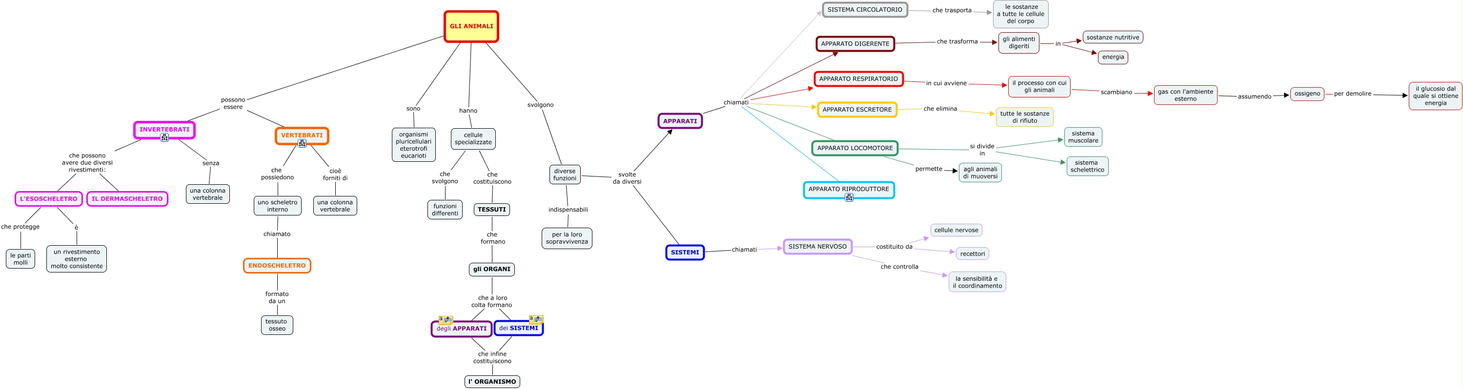 Questa Cmap, creata con IHMC CmapTools, contiene informazioni relative a: gli animali 1, diverse funzioni indispensabili per la loro sopravvivenza, APPARATI chiamati APPARATO RESPIRATORIO, cellule specializzate che svolgono funzioni differenti, diverse funzioni svolte da diversi APPARATI, gli alimenti digeriti in sostanze nutritive, APPARATI chiamati APPARATO DIGERENTE, GLI ANIMALI hanno cellule specializzate, GLI ANIMALI possono essere VERTEBRATI, GLI ANIMALI svolgono diverse funzioni, APPARATO ESCRETORE che elimina tutte le sostanze di rifiuto, diverse funzioni svolte da diversi SISTEMI, APPARATO LOCOMOTORE si divide in sistema schelettrico, SISTEMA NERVOSO costituito da recettori, L'ESOSCHELETRO è un rivestimento esterno molto consistente, GLI ANIMALI possono essere INVERTEBRATI, TESSUTI che formano gli ORGANI, uno scheletro interno chiamato ENDOSCHELETRO, SISTEMA CIRCOLATORIO che trasporta le sostanze a tutte le cellule del corpo, ENDOSCHELETRO formato da un tessuto osseo, gli ORGANI che a loro colta formano degli APPARATI
