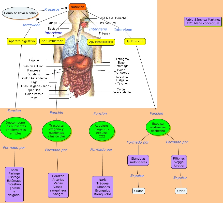 Este Cmap, tiene información relacionada con: Cómo se lleva a cabo la nutrición7, Trasporta oxígeno y nutrientes a las células Formado por Corazón Arterias Venas Vasos sanguíneos Sangre, Expulsa sustancias deshecho Formado por Glándulas sudoríparas, Descompone los nutrientes en elementos simples Formado por Boca Faringe Esófago Estómago Intestino grueso y delgado, Aparato digestivo Función Descompone los nutrientes en elementos simples, Ap Circulatorio Función Trasporta oxígeno y nutrientes a las células, Glándulas sudoríparas Expulsa Sudor, Adquiere oxígeno y expulsa CO2 Formado por Naríz Tráquea Pulmones Bronquios Bronquiolos, Ap. Respiratorio Función Adquiere oxígeno y expulsa CO2, Expulsa sustancias deshecho Formado por Riñones Vejiga Uretra, Nutrición Interviene Ap. Respiratorio, Como se lleva a cabo Procesos Nutrición, Nutrición Interviene Ap Excretor, Nutrición Interviene Aparato digestivo, Ap Excretor Función Expulsa sustancias deshecho, Nutrición Interviene Ap Circulatorio, Riñones Vejiga Uretra Expulsa Orina