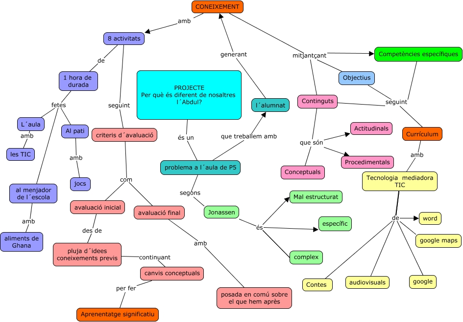 Este Cmap, tiene información relacionada con: projecte, Competències específiques seguint Currículum, Tecnologia mediadora TIC de Contes, Jonassen és complex, CONEIXEMENT amb 8 activitats, Tecnologia mediadora TIC de audiovisuals, avaluació final amb posada en comú sobre el que hem après, Currículum amb Tecnologia mediadora TIC, Continguts seguint Currículum, Jonassen és Mal estructurat, 1 hora de durada fetes Al pati, Tecnologia mediadora TIC de word, problema a l´aula de P5 segons Jonassen, 8 activitats seguint criteris d´avaluació, PROJECTE Per què és diferent de nosaltres l´Abdul? és un problema a l´aula de P5, Tecnologia mediadora TIC de google maps, Tecnologia mediadora TIC de audiovisuals, CONEIXEMENT mitjantçant Competències específiques, al menjador de l´escola amb aliments de Ghana, Objectius seguint Currículum, Continguts que són Procedimentals