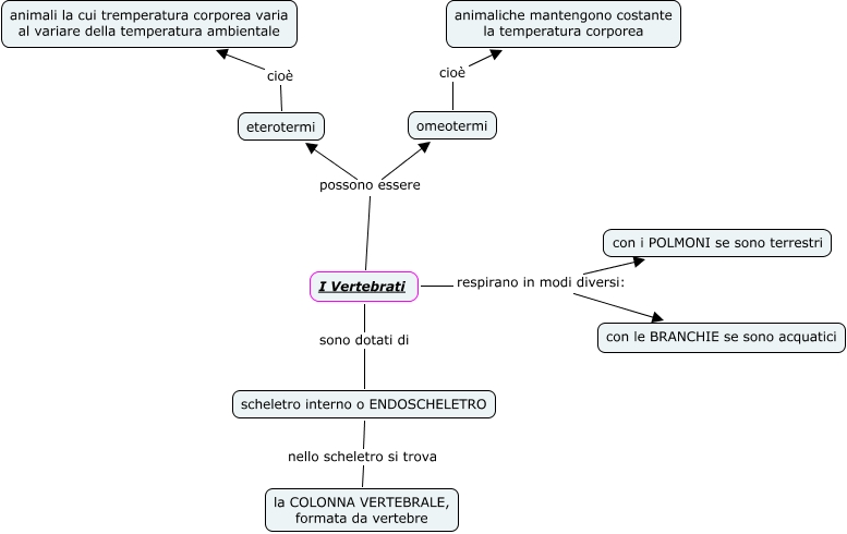 Questa Cmap, creata con IHMC CmapTools, contiene informazioni relative a: i Vertebrati, eterotermi cioè animali la cui tremperatura corporea varia al variare della temperatura ambientale, I Vertebrati possono essere omeotermi, scheletro interno o ENDOSCHELETRO nello scheletro si trova la COLONNA VERTEBRALE, formata da vertebre, I Vertebrati respirano in modi diversi: con le BRANCHIE se sono acquatici, I Vertebrati possono essere eterotermi, I Vertebrati sono dotati di scheletro interno o ENDOSCHELETRO, I Vertebrati respirano in modi diversi: con i POLMONI se sono terrestri, omeotermi cioè animaliche mantengono costante la temperatura corporea