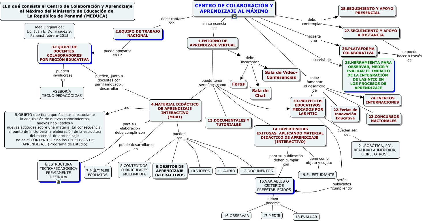 Este Cmap, tiene información relacionada con: Centro de Colaboración y Aprendizaje al Máximo, 4.MATERIAL DIDÁCTICO DE APRENDIZAJE INTERACTIVO (MDAI) pueden ser 12.DOCUMENTOS, CENTRO DE COLABORACIÓN Y APRENDIZAJE AL MÁXIMO debe fomentar el desarrollo de 20.PROYECTOS EDUCATIVOS MEDIADOS POR LAS NTIC, CENTRO DE COLABORACIÓN Y APRENDIZAJE AL MÁXIMO debe contemplar 27.SEGUIMIENTO Y APOYO A DISTANCIA, 27.SEGUIMIENTO Y APOYO A DISTANCIA se puede hacer a través de 26.PLATAFORMA COLABORATIVA, 2.EQUIPO DE TRABAJO NACIONAL puede apoyarse en un 3.EQUIPO DE DOCENTES COLABORADORES POR REGIÓN EDUCATIVA, 14.EXPERIENCIAS EXITOSAS: APLICANDO MATERIAL DIDÁCTICO DE APRENDIZAJE (INTERACTIVO) tiene como objeto y sujeto 19.EL ESTUDIANTE, 4.MATERIAL DIDÁCTICO DE APRENDIZAJE INTERACTIVO (MDAI) pueden ser 11.AUDIO, CENTRO DE COLABORACIÓN Y APRENDIZAJE AL MÁXIMO debe fomentar el desarrollo de 22.Ferias de Innovación Educativa, 20.PROYECTOS EDUCATIVOS MEDIADOS POR LAS NTIC serán publicados cumpliendo 15.VARIABLES O CRITERIOS PREESTABLECIDOS, 14.EXPERIENCIAS EXITOSAS: APLICANDO MATERIAL DIDÁCTICO DE APRENDIZAJE (INTERACTIVO) para su publicación deben cumplir con 15.VARIABLES O CRITERIOS PREESTABLECIDOS, 1.ENTORNO DE APRENDIZAJE VIRTUAL puede tener secciónes como 4.MATERIAL DIDÁCTICO DE APRENDIZAJE INTERACTIVO (MDAI), 15.VARIABLES O CRITERIOS PREESTABLECIDOS deben poderse 18.EVALUAR, 3.EQUIPO DE DOCENTES COLABORADORES POR REGIÓN EDUCATIVA pueden, junto a docentes con perfíl innovador, desarrollar 4.MATERIAL DIDÁCTICO DE APRENDIZAJE INTERACTIVO (MDAI), CENTRO DE COLABORACIÓN Y APRENDIZAJE AL MÁXIMO en su esencia es: 1.ENTORNO DE APRENDIZAJE VIRTUAL, 1.ENTORNO DE APRENDIZAJE VIRTUAL debe incorporar Sala de Video- Conferencias, 4.MATERIAL DIDÁCTICO DE APRENDIZAJE INTERACTIVO (MDAI) puede desarrollarse en 7.MÚLTIPLES FORMATOS, 20.PROYECTOS EDUCATIVOS MEDIADOS POR LAS NTIC pueden ser de: 21.ROBÓTICA, PDI, REALIDAD AUMENTADA, LIBRE, OTROS..., CENTRO DE COLABORACIÓN Y APRENDIZAJE AL MÁXIMO debe fomentar el desarrollo de 24.EVENTOS INTERNACIONES, CENTRO DE COLABORACIÓN Y APRENDIZAJE AL MÁXIMO debe fomentar el desarrollo de 23.CONCURSOS NACIONALES, CENTRO DE COLABORACIÓN Y APRENDIZAJE AL MÁXIMO necesita una 26.PLATAFORMA COLABORATIVA