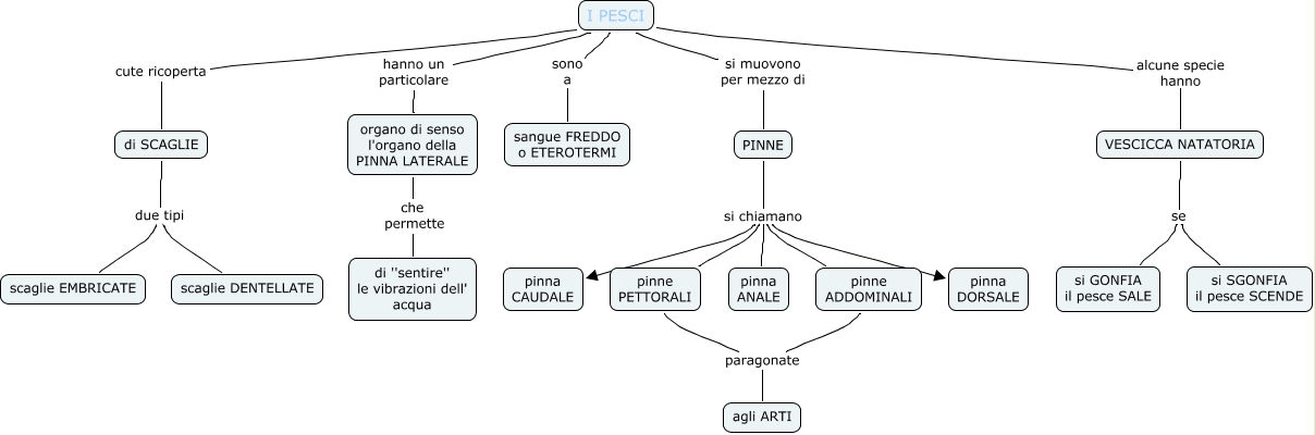Questa Cmap, creata con IHMC CmapTools, contiene informazioni relative a: I PESCI, pinne PETTORALI paragonate agli ARTI, VESCICCA NATATORIA se si GONFIA il pesce SALE, I PESCI hanno un particolare organo di senso l'organo della PINNA LATERALE, I PESCI alcune specie hanno VESCICCA NATATORIA, I PESCI si muovono per mezzo di PINNE, pinne ADDOMINALI paragonate agli ARTI, di SCAGLIE due tipi scaglie DENTELLATE, organo di senso l'organo della PINNA LATERALE che permette di ''sentire'' le vibrazioni dell' acqua, PINNE si chiamano pinne PETTORALI, di SCAGLIE due tipi scaglie EMBRICATE, PINNE si chiamano pinne ADDOMINALI, PINNE si chiamano pinna DORSALE, PINNE si chiamano pinna ANALE, PINNE si chiamano pinna CAUDALE, I PESCI cute ricoperta di SCAGLIE, VESCICCA NATATORIA se si SGONFIA il pesce SCENDE, I PESCI sono a sangue FREDDO o ETEROTERMI