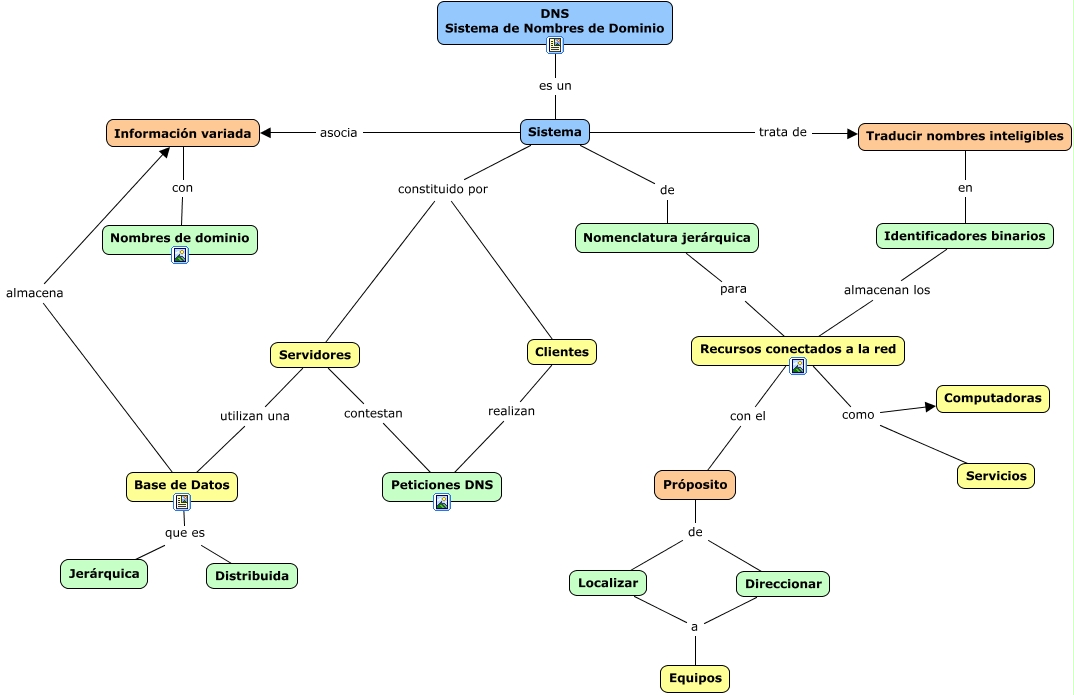 Este Cmap, tiene información relacionada con: DNS, Servidores contestan Peticiones DNS, Direccionar a Equipos, Traducir nombres inteligibles en Identificadores binarios, Recursos conectados a la red como Servicios, Base de Datos que es Distribuida, Información variada con Nombres de dominio, Base de Datos que es Jerárquica, DNS Sistema de Nombres de Dominio es un Sistema, Localizar a Equipos, Recursos conectados a la red con el Próposito, Clientes realizan Peticiones DNS, Servidores utilizan una Base de Datos, Identificadores binarios almacenan los Recursos conectados a la red, Sistema constituido por Clientes, Sistema constituido por Servidores, Sistema trata de Traducir nombres inteligibles, Próposito de Direccionar, Base de Datos almacena Información variada, Recursos conectados a la red como Computadoras, Sistema asocia Información variada