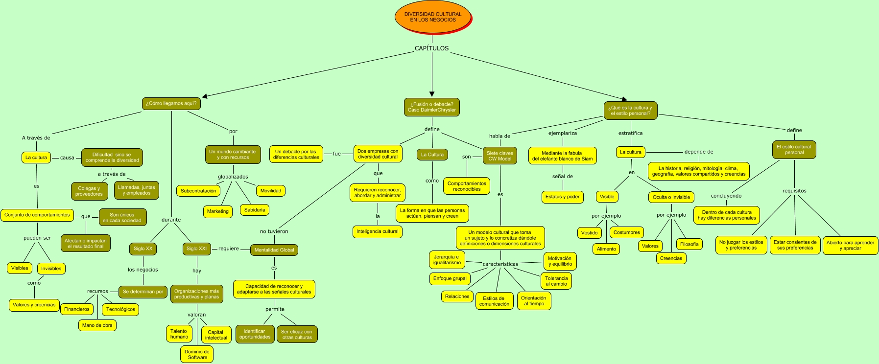 Este Cmap, tiene información relacionada con: Conceptos Fundamentales de Geopolítica, Cultura y Neogociación Intercultural, Un modelo cultural que toma un sujeto y lo concretiza dándole definiciones o dimensiones culturales características Tolerancia al cambio, Mediante la fabula del elefante blanco de Siam señal de Estatus y poder, Un modelo cultural que toma un sujeto y lo concretiza dándole definiciones o dimensiones culturales características Enfoque grupal, Un mundo cambiante y con recursos globalizados Marketing, ¿Fusión o debacle? Caso DaimlerChrysler define La Cultura, Un mundo cambiante y con recursos globalizados Subcontratación, Un modelo cultural que toma un sujeto y lo concretiza dándole definiciones o dimensiones culturales características Motivación y equilibrio, Requieren reconocer, abordar y administrar la Inteligencia cultural, Organizaciones más productivas y planas valoran Dominio de Software, DIVERSIDAD CULTURAL EN LOS NEGOCIOS CAPÍTULOS ¿Fusión o debacle? Caso DaimlerChrysler, La cultura en Oculta o Invisible, ¿Cómo llegamos aquí? A través de La cultura, Mentalidad Global es Capacidad de reconocer y adaptarse a las señales culturales, Invisibles como Valores y creencias, Oculta o Invisible por ejemplo Filosofía, ¿Fusión o debacle? Caso DaimlerChrysler define Siete claves CW Model, Conjunto de comportamientos que Son únicos en cada sociedad, El estilo cultural personal concluyendo Dentro de cada cultura hay diferencias personales, Organizaciones más productivas y planas valoran Talento humano, Un mundo cambiante y con recursos globalizados Sabiduría