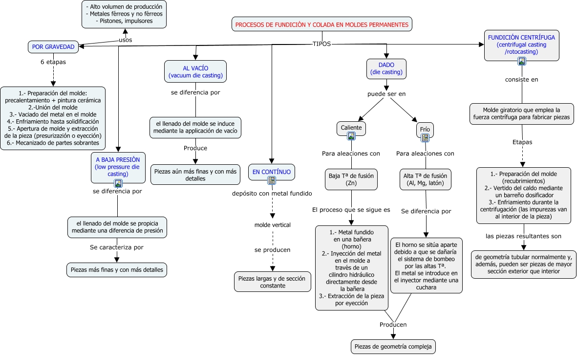 Este Cmap, tiene información relacionada con: Mario.MartinezSanchez, Caliente Para aleaciones con Baja Tª de fusión (Zn), FUNDICIÓN CENTRÍFUGA (centrifugal casting /rotocasting) consiste en Molde giratorio que emplea la fuerza centrífuga para fabricar piezas, POR GRAVEDAD 6 etapas 1.- Preparación del molde: precalentamiento + pintura cerámica 2.-Unión del molde 3.- Vaciado del metal en el molde 4.- Enfriamiento hasta solidificación 5.- Apertura de molde y extracción de la pieza (presurizazión o eyección) 6.- Mecanizado de partes sobrantes, DADO (die casting) puede ser en Frío, 1.- Metal fundido en una bañera (horno) 2.- Inyección del metal en el molde a través de un cilindro hidráulico directamente desde la bañera 3.- Extracción de la pieza por eyección Producen Piezas de geometría compleja, PROCESOS DE FUNDICIÓN Y COLADA EN MOLDES PERMANENTES TIPOS A BAJA PRESIÓN (low pressure die casting), 1.- Preparación del molde (recubrimientos) 2.- Vertido del caldo mediante un barreño dosificador 3.- Enfriamiento durante la centrifugación (las impurezas van al interior de la pieza) las piezas resultantes son de geometría tubular normalmente y, además, pueden ser piezas de mayor sección exterior que interior, A BAJA PRESIÓN (low pressure die casting) se diferencia por el llenado del molde se propicia mediante una diferencia de presión, el llenado del molde se propicia mediante una diferencia de presión Se caracteriza por Piezas más finas y con más detalles, AL VACÍO (vacuum die casting) se diferencia por el llenado del molde se induce mediante la applicación de vacío, PROCESOS DE FUNDICIÓN Y COLADA EN MOLDES PERMANENTES TIPOS AL VACÍO (vacuum die casting), DADO (die casting) puede ser en Caliente, PROCESOS DE FUNDICIÓN Y COLADA EN MOLDES PERMANENTES TIPOS DADO (die casting), PROCESOS DE FUNDICIÓN Y COLADA EN MOLDES PERMANENTES TIPOS FUNDICIÓN CENTRÍFUGA (centrifugal casting /rotocasting), Baja Tª de fusión (Zn) El proceso que se sigue es 1.- Metal fundido en una bañera (horno) 2.- Inyección del metal en el molde a través de un cilindro hidráulico directamente desde la bañera 3.- Extracción de la pieza por eyección, Alta Tª de fusión (Al, Mg, latón) Se diferencia por El horno se sitúa aparte debido a que se dañaría el sistema de bombeo por las altas Tª. El metal se introduce en el inyector mediante una cuchara, POR GRAVEDAD usos - Alto volumen de producción - Metales férreos y no férreos - Pistones, impulsores, El horno se sitúa aparte debido a que se dañaría el sistema de bombeo por las altas Tª. El metal se introduce en el inyector mediante una cuchara Producen Piezas de geometría compleja, EN CONTÍNUO depósito con metal fundido molde vertical, Molde giratorio que emplea la fuerza centrífuga para fabricar piezas Etapas 1.- Preparación del molde (recubrimientos) 2.- Vertido del caldo mediante un barreño dosificador 3.- Enfriamiento durante la centrifugación (las impurezas van al interior de la pieza)