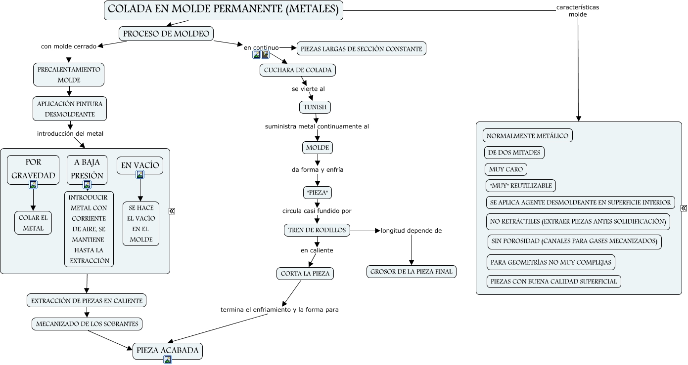 Este Cmap, tiene información relacionada con: JESÚS CARDEÑA BENITO, PROCESO DE MOLDEO en continuo PIEZAS LARGAS DE SECCIÓN CONSTANTE, COLADA EN MOLDE PERMANENTE (METALES) características molde ????, COLADA EN MOLDE PERMANENTE (METALES) PROCESO DE MOLDEO, MOLDE da forma y enfría "PIEZA", CORTA LA PIEZA termina el enfriamiento y la forma para PIEZA ACABADA, TUNISH suministra metal continuamente al MOLDE, POR GRAVEDAD COLAR EL METAL, PRECALENTAMIENTO MOLDE APLICACIÓN PINTURA DESMOLDEANTE, MECANIZADO DE LOS SOBRANTES PIEZA ACABADA, EN VACÍO SE HACE EL VACÍO EN EL MOLDE, PROCESO DE MOLDEO con molde cerrado PRECALENTAMIENTO MOLDE, EXTRACCIÓN DE PIEZAS EN CALIENTE MECANIZADO DE LOS SOBRANTES, APLICACIÓN PINTURA DESMOLDEANTE introducción del metal ????, TREN DE RODILLOS en caliente CORTA LA PIEZA, "PIEZA" circula casi fundido por TREN DE RODILLOS, A BAJA PRESIÓN INTRODUCIR METAL CON CORRIENTE DE AIRE, SE MANTIENE HASTA LA EXTRACCIÓN, PROCESO DE MOLDEO en continuo CUCHARA DE COLADA, TREN DE RODILLOS longitud depende de GROSOR DE LA PIEZA FINAL, CUCHARA DE COLADA se vierte al TUNISH, ???? ???? EXTRACCIÓN DE PIEZAS EN CALIENTE