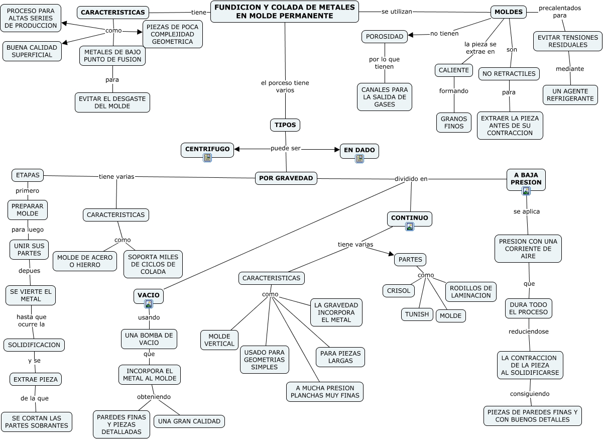 Este Cmap, tiene información relacionada con: Colada en moldes permanentes AitorFernándezAntón, PARTES como MOLDE, CARACTERISTICAS como BUENA CALIDAD SUPERFICIAL, POROSIDAD por lo que tienen CANALES PARA LA SALIDA DE GASES, CARACTERISTICAS como PIEZAS DE POCA COMPLEJIDAD GEOMETRICA, CONTINUO tiene varias PARTES, LA GRAVEDAD INCORPORA EL METAL como A MUCHA PRESION PLANCHAS MUY FINAS, CARACTERISTICAS como USADO PARA GEOMETRIAS SIMPLES, UNA GRAN CALIDAD obteniendo PAREDES FINAS Y PIEZAS DETALLADAS, CARACTERISTICAS como PROCESO PARA ALTAS SERIES DE PRODUCCION, MOLDES no tienen POROSIDAD, A BAJA PRESION se aplica PRESION CON UNA CORRIENTE DE AIRE, TIPOS puede ser CENTRIFUGO, MOLDE VERTICAL como A MUCHA PRESION PLANCHAS MUY FINAS, ETAPAS primero PREPARAR MOLDE, FUNDICION Y COLADA DE METALES EN MOLDE PERMANENTE el porceso tiene varios TIPOS, POR GRAVEDAD tiene varias CARACTERISTICAS, PARTES como TUNISH, METALES DE BAJO PUNTO DE FUSION para EVITAR EL DESGASTE DEL MOLDE, MOLDE VERTICAL como PARA PIEZAS LARGAS, CARACTERISTICAS como METALES DE BAJO PUNTO DE FUSION