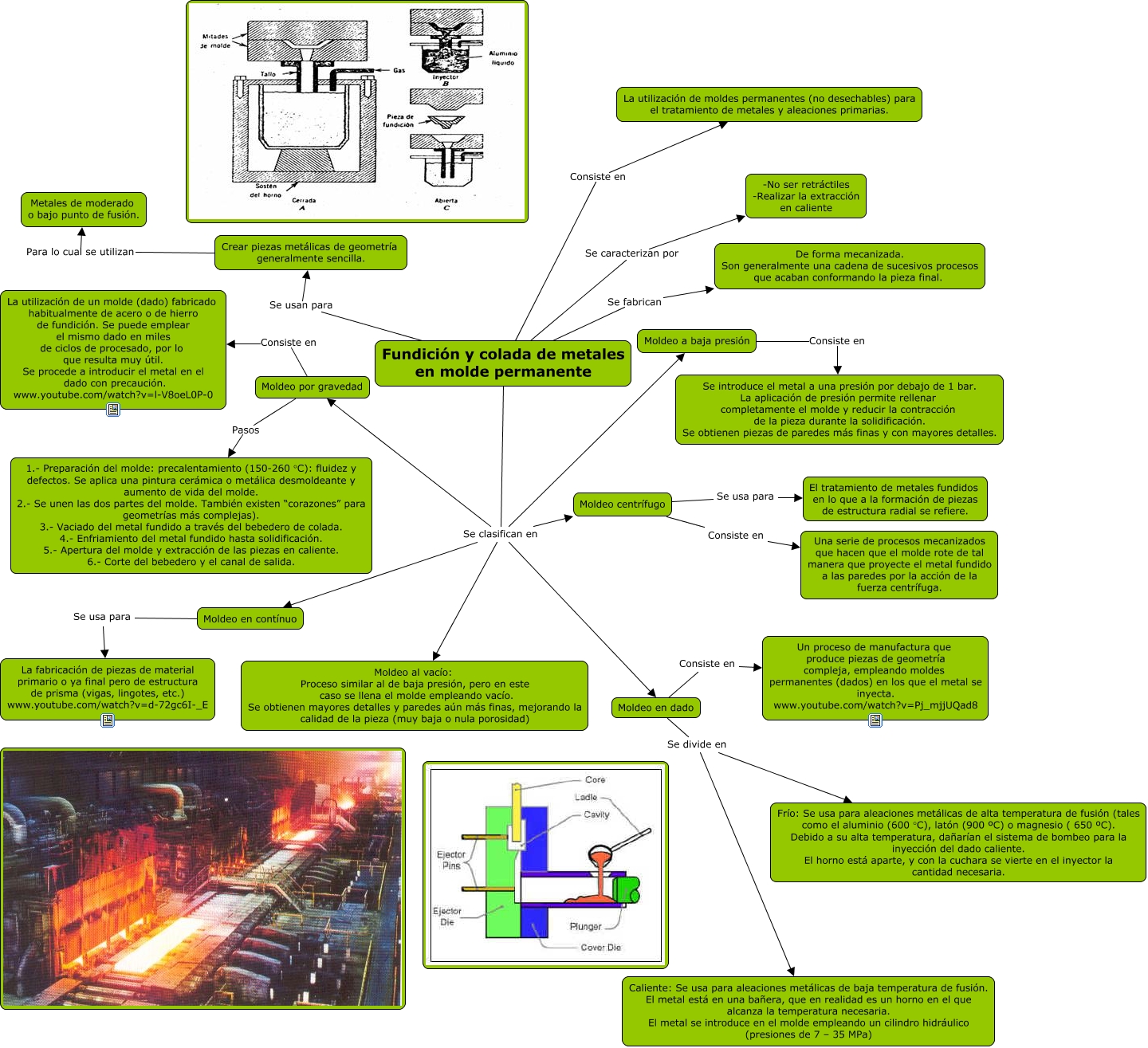 Este Cmap, tiene información relacionada con: Fundición y olada de metales en molde permanente, Moldeo centrífugo Consiste en Una serie de procesos mecanizados que hacen que el molde rote de tal manera que proyecte el metal fundido a las paredes por la acción de la fuerza centrífuga., Moldeo por gravedad Pasos 1.- Preparación del molde: precalentamiento (150-260 °C): fluidez y defectos. Se aplica una pintura cerámica o metálica desmoldeante y aumento de vida del molde. 2.- Se unen las dos partes del molde. También existen “corazones” para geometrías más complejas). 3.- Vaciado del metal fundido a través del bebedero de colada. 4.- Enfriamiento del metal fundido hasta solidificación. 5.- Apertura del molde y extracción de las piezas en caliente. 6.- Corte del bebedero y el canal de salida., Moldeo a baja presión Consiste en Se introduce el metal a una presión por debajo de 1 bar. La aplicación de presión permite rellenar completamente el molde y reducir la contracción de la pieza durante la solidificación. Se obtienen piezas de paredes más finas y con mayores detalles., Fundición y colada de metales en molde permanente Se clasifican en Moldeo en dado, Fundición y colada de metales en molde permanente Se usan para Crear piezas metálicas de geometría generalmente sencilla., Fundición y colada de metales en molde permanente Se clasifican en Moldeo a baja presión, Moldeo en contínuo Se usa para La fabricación de piezas de material primario o ya final pero de estructura de prisma (vigas, lingotes, etc.) www.youtube.com/watch?v=d-72gc6I-_E, Moldeo en dado Se divide en Frío: Se usa para aleaciones metálicas de alta temperatura de fusión (tales como el aluminio (600 °C), latón (900 ºC) o magnesio ( 650 ºC). Debido a su alta temperatura, dañarían el sistema de bombeo para la inyección del dado caliente. El horno está aparte, y con la cuchara se vierte en el inyector la cantidad necesaria., Moldeo en dado Consiste en Un proceso de manufactura que produce piezas de geometría compleja, empleando moldes permanentes (dados) en los que el metal se inyecta. www.youtube.com/watch?v=Pj_mjjUQad8, Fundición y colada de metales en molde permanente Se fabrican De forma mecanizada. Son generalmente una cadena de sucesivos procesos que acaban conformando la pieza final., Moldeo centrífugo Se usa para El tratamiento de metales fundidos en lo que a la formación de piezas de estructura radial se refiere., Moldeo por gravedad Consiste en La utilización de un molde (dado) fabricado habitualmente de acero o de hierro de fundición. Se puede emplear el mismo dado en miles de ciclos de procesado, por lo que resulta muy útil. Se procede a introducir el metal en el dado con precaución. www.youtube.com/watch?v=l-V8oeL0P-0, Moldeo en dado Se divide en Caliente: Se usa para aleaciones metálicas de baja temperatura de fusión. El metal está en una bañera, que en realidad es un horno en el que alcanza la temperatura necesaria. El metal se introduce en el molde empleando un cilindro hidráulico (presiones de 7 – 35 MPa), Fundición y colada de metales en molde permanente Consiste en La utilización de moldes permanentes (no desechables) para el tratamiento de metales y aleaciones primarias., Fundición y colada de metales en molde permanente Se clasifican en Moldeo centrífugo, Fundición y colada de metales en molde permanente Se caracterizan por -No ser retráctiles -Realizar la extracción en caliente, Fundición y colada de metales en molde permanente Se clasifican en Moldeo al vacío: Proceso similar al de baja presión, pero en este caso se llena el molde empleando vacío. Se obtienen mayores detalles y paredes aún más finas, mejorando la calidad de la pieza (muy baja o nula porosidad), Crear piezas metálicas de geometría generalmente sencilla. Para lo cual se utilizan Metales de moderado o bajo punto de fusión., Fundición y colada de metales en molde permanente Se clasifican en Moldeo por gravedad, Fundición y colada de metales en molde permanente Se clasifican en Moldeo en contínuo