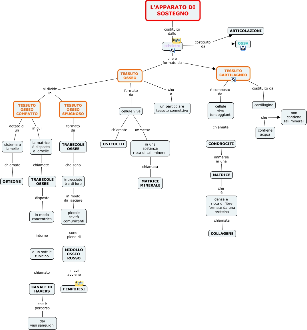 Questa Cmap, creata con IHMC CmapTools, contiene informazioni relative a: L'APPARATO DI SOSTEGNO, MATRICE che è densa e ricca di fibre formate da una proteina, in una sostanza ricca di sali minerali chiamata MATRICE MINERALE, cellule vive tondeggianti chiamate CONDROCITI, piccole cavità comunicanti sono piene di MIDOLLO OSSEO ROSSO, TESSUTO OSSEO che è un particolare tessuto connettivo, TESSUTO OSSEO COMPATTO in cui la matrice è disposta a lamelle, scheletro costituito da ARTICOLAZIONI, cartillagine che non contiene sali minerali, in modo concentrico intorno a un sottile tubicino, scheletro costituito da OSSA, TESSUTO OSSEO si divide in TESSUTO OSSEO SPUGNOSO, densa e ricca di fibre formate da una proteina chiamata COLLAGENE, intrecciate tra di loro in modo da lasciare piccole cavità comunicanti, TESSUTO OSSEO COMPATTO dotato di un sistema a lamelle, cellule vive immerse in una sostanza ricca di sali minerali, TRABECOLE OSSEE che sono intrecciate tra di loro, la matrice è disposta a lamelle chiamate TRABECOLE OSSEE, TESSUTO CARTILAGNEO è composto da cellule vive tondeggianti, CANALE DI HAVERS che è percorso dai vasi sanguigni, scheletro che è formato da TESSUTO CARTILAGNEO