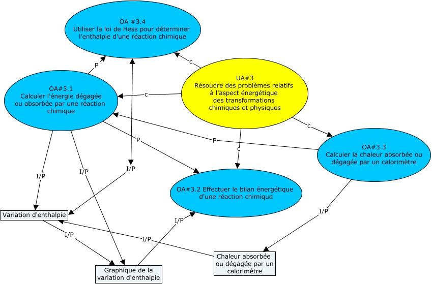 Cette carte de concepts créée avec IHMC CmapTools traite de: UA3, OA#3.1 Calculer l'énergie dégagée ou absorbée par une réaction chimique P OA#3.2 Effectuer le bilan énergétique d'une réaction chimique, UA#3 Résoudre des problèmes relatifs à l'aspect énergétique des transformations chimiques et physiques c OA#3.1 Calculer l'énergie dégagée ou absorbée par une réaction chimique, OA#3.3 Calculer la chaleur absorbée ou dégagée par un calorimètre I/P Chaleur absorbée ou dégagée par un calorimètre, OA#3.1 Calculer l'énergie dégagée ou absorbée par une réaction chimique I/P Graphique de la variation d'enthalpie, UA#3 Résoudre des problèmes relatifs à l'aspect énergétique des transformations chimiques et physiques c OA#3.3 Calculer la chaleur absorbée ou dégagée par un calorimètre, OA#3.1 Calculer l'énergie dégagée ou absorbée par une réaction chimique P OA #3.4 Utiliser la loi de Hess pour déterminer l'enthalpie d'une réaction chimique, UA#3 Résoudre des problèmes relatifs à l'aspect énergétique des transformations chimiques et physiques c OA#3.2 Effectuer le bilan énergétique d'une réaction chimique, UA#3 Résoudre des problèmes relatifs à l'aspect énergétique des transformations chimiques et physiques c OA #3.4 Utiliser la loi de Hess pour déterminer l'enthalpie d'une réaction chimique, Graphique de la variation d'enthalpie I/P OA#3.2 Effectuer le bilan énergétique d'une réaction chimique, OA#3.1 Calculer l'énergie dégagée ou absorbée par une réaction chimique I/P Variation d'enthalpie, OA #3.4 Utiliser la loi de Hess pour déterminer l'enthalpie d'une réaction chimique I/P Variation d'enthalpie, Variation d'enthalpie I/P Graphique de la variation d'enthalpie, OA#3.3 Calculer la chaleur absorbée ou dégagée par un calorimètre P OA#3.1 Calculer l'énergie dégagée ou absorbée par une réaction chimique, Chaleur absorbée ou dégagée par un calorimètre I/P Variation d'enthalpie